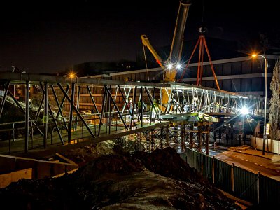 Původní a nová budova jsou propojeny lávkou, která byla nainstalována během posledního březnového víkendu. Práce si vyžádaly úplnou výluku ulice Radlická, přes kterou 163 t vážící a 90,93 m měřící ocelová konstrukce lávky vede. Na své místo ji s maximální opatrností usazoval autojeřáb s nosností 500 t.