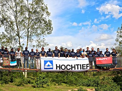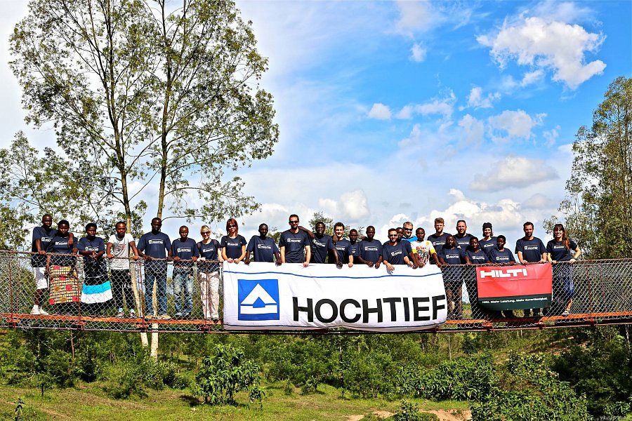 The main objective of the Bridges to Prosperity (B2P) project is to design and construct footbridges and bridges over creeks and rivers in poor African countries. HOCHTIEF focuses on the Republic of Rwanda. Each year, a team consisting of ten members sets out with the mission to build a safe crossing of river in those places where local people get across watercourses on slippery rocks and so they risk their lives on a daily basis.