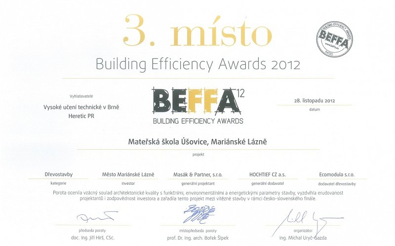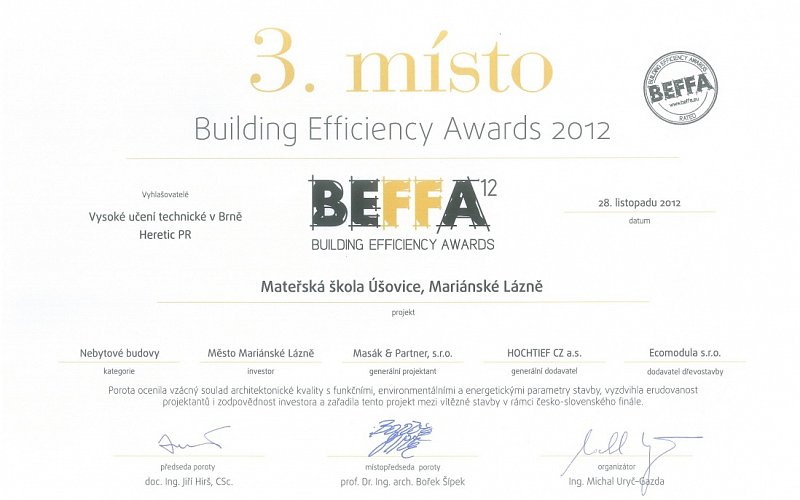 Úspěch v mezinárodní soutěži BEFFA - Společnost HOCHTIEF CZ získala dvě 3. místa v prvnímmezinárodním srovnání českých a slovenských architektonicky a energeticky výjimečných staveb Building Efficiency Awards 2012 (BEFFA). Soutěž hodnotí současné stavební projekty s výjimečnou energetickou, konstrukční a architektonickou hodnotou realizované v České a Slovenské republice.