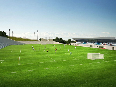 During the conversion, the football pitches will be extended as well. The main football pitch will then allow adaptation to three crosswise practice fields, but, at the same time, it can be used as a standard pitch for championship matches. Instead of one practice pitch in the south part of the complex, we will build two new ones. One with artificial turf, the other one with natural turf. At the main pitch, a new stand with a capacity of 450 seats will be built, under which a covered 60-metre long running track will be situated.
