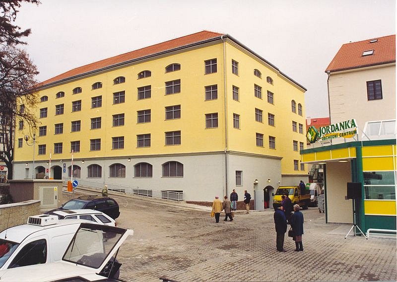 | Description: | The reconstruction consisted in the interconnection of two separate buildings, with the aim of creating a multipurpose compound. The structure has 4 aboveground floors and 1 underground floor. The original load-bearing brick structure 78 centimetres thick was strengthened with a ferro-concrete skeleton. A part of the walls was demolished. The restaurant is located in the first underground floor where there are well-preserved original vaulted ceilings. The second aboveground floor is designed as a shopping mall above the grocery store, situated on the first aboveground floor. From this mall, the individual shops can be entered. On the third and fourth floors there are nine luxurious maisonette apartments.Wooden replicas of the original atypical windows were used in the whole building. The roof above the glass entrance part and above the shopping mall is of asphalt strewn with gravel, while the sloping roofs are covered with plain clay tiles. The parking area of 2,100 square metres is paved with concrete interlocking pavers and is controlled by an automatic parking system. |