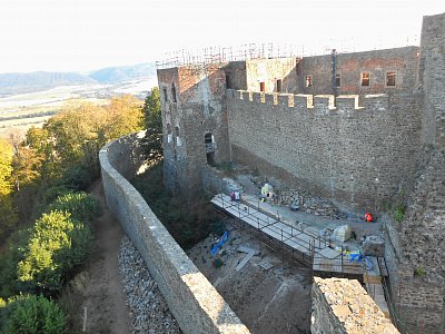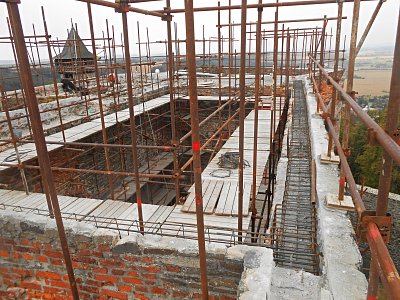 The objective of the reconstruction works is to preserve the castle and to open it to the public. The very basis is the necessary works connected with structural measures on the castle walls and remnants of the vaults by means of micropiling, helical reinforcement and fastening with ropes and repairs of the existing structures. Once the core is completed, new structures will be inserted having both utility and aesthetic functions. These will help to convert the rooms that are very similar now into various, semi-closed rooms having their roofs at various heights or that are open. These three materials will be primarily used for the new structures – steel with forced patina, polished concrete and glass. A crucial and clear requirement of the heritage authority has been to build a roof over the newly inserted exhibition rooms as a parapet, which does not exceed the existing height and volume of the castle. The rooms between the existing wall structures are roofed with a thin and delicate translucent glass membrane. For functional and aesthetic reasons, the glass is sandblasted. It will make its maintenance easier and, at the same time, it will diffuse the light and will thus create excellent light conditions for the new exhibition rooms and light up the castle architecture. A total of 5 exhibition rooms are designed to be glass-roofed and a roof structure will be built over two staircases too. |
