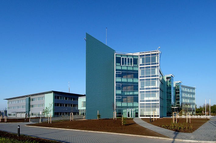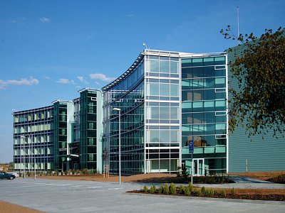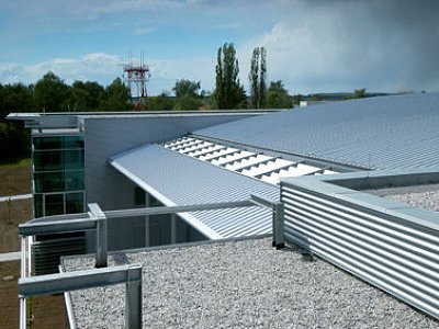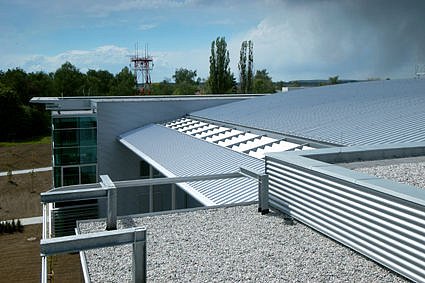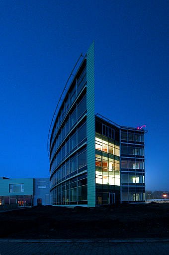 The architectonic look of the complex should - by use of high-technology materials - express the relation to aviation. Glazed areas combined with naturally satin anodized aluminium are applied mainly on the office building and transparent facing and roofing of the atrium. For the outside facade of the building hung-up glazed system structures are applied, supplemented - in exposed parts - with a frontal system of horizontal blinds with a possibility of smooth daylight intensity regulation. The staircases and indoor gardens are glazed with green tint tempered glass. Full parts of facades are covered with aluminium panels of antiqued copper shade and in the operating part with corrugated sheet of silver shade. The roofs of the operating building with bracket cornices differ - in material and roofing - from those of central pavilions, which are visual and partly covered with greenery.