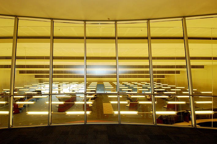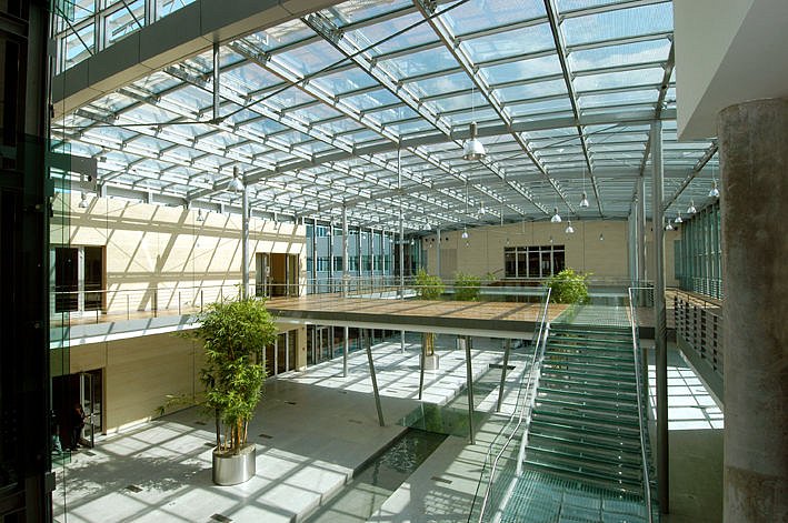 With respect to the loess subsoil the whole complex of buildings is founded on piles. Bearing structures are mainly ferroconcrete and monolithic. The monolithic skeleton with a width of span comprising 7.2 m was applied both for the office and the operating building. Here – due to multiple wiring – double floors were designed. In exposed parts of the center there are designed steel bearing structures, which are a conspicuous architectonic element both in the exterior and in the interior. Steel is applied mostly in the arcade, where the exposed structure combined with glazed places gives an impression of lightness, transparency and connection with the exterior. Drawn and reinforcing elements are designed from adjustable DETA stripes. Steel was applied in similar way also in case of the hung-up arched facade of the glazed southern part of the office building. Steel structure is designed also for the roofing of the ATS hall, using steel trussed arches with a width of span comprising 29.5 m. The space between ironties is used as an inspection and installation floor. The roof overhang with stable sun breakers is supported by four steel columns, forming the so called „grand order“.