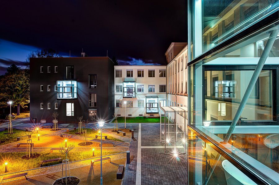 Cílem projektu byla modernizace objektu Ostravské univerzity, který se nachází v areálu bývalé krajské nemocnice v Ostravě Zábřehu. Od svého vybudování na počátku 20. století byl objekt několikrát přestavován a rozšiřován, až se rozrostl do nesourodé podoby jedno až třípodlažní stavby s různými úrovněmi jednotlivých podlaží. Základní koncepcí řešení a záměrem navržené konstrukce stávajícího objektu bylo vytvoření plnohodnotné vysokoškolské budovy a vybudování komplexní výukové a výzkumné základny Lékařské fakulty Ostravské univerzity. Výstavbou přístavby a nástavby došlo ke sjednocení výškové úrovně celého objektu a dvůr se stal hlavním nástupním prostorem. Povrchy doplněných hmot jsou v černém odstínu, který v kombinaci s bílými fasádami původních křídel vytváří exkluzivní výraz odpovídající významu budovy. Objekt je rozdělen na tři části, přičemž každá část je řešena jako samostatný objekt. Objekt A: Objekt lékařské fakulty - je umístěn v severním a východním křídle a nástavbě východního křídla. Objekt B: Objekt IMTO - se nachází v západním křídle s novou přístavbou. Objekt C: Velkokapacitní posluchárna - je umístěna v severozápadním křídle a v nástavbě tohoto křídla. |