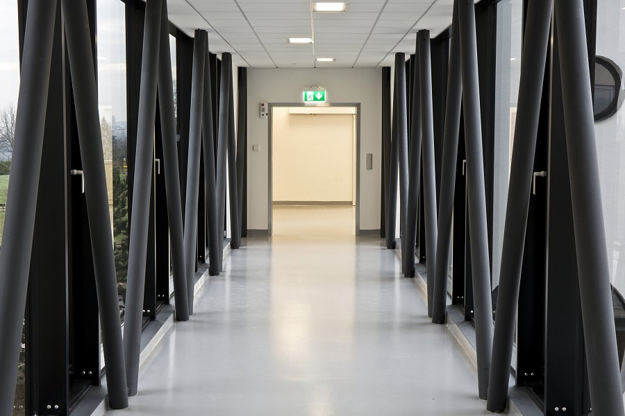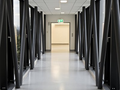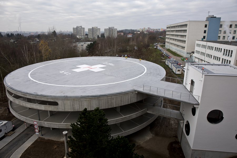 Stávající areál nemocnice má strohou architekturu, kterou měl projekt nově vzniklého multifunkčního celku oživit. Dominantním prvkem se stala třípodlažní kruhová konstrukce parkovacího domu s 56 parkovacími místy pro zaměstnance nemocnice, na jehož střeše je umístěna zmiňovaná přistávací plocha pro vrtulníky. V komunikačních vertikálách se nacházejí místnosti provozního a technického zázemí heliportu, únikové schodiště pro vstup a výstup z parkovacího domu a současně objekt zajišťuje i přímý přístup k přistávací ploše. Spojovací most výrazně urychlí cestu od přistání vrtulníku na oddělení urgentního příjmu a traumatologie. Stavba zahrnovala také vybudování zázemí pro pracovníky letecké záchranné služby (LZS) a předávací místnosti ve stávajícím objektu nemocnice, kde dochází k předání pacientů z rukou LZS zdravotnickému personálu nemocnice. Pacienti budou z vrtulníku transportováni krytým spojovacím koridorem přímo do budovy traumacentra bez nutnosti využití sanitních vozidel. |
