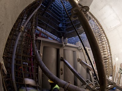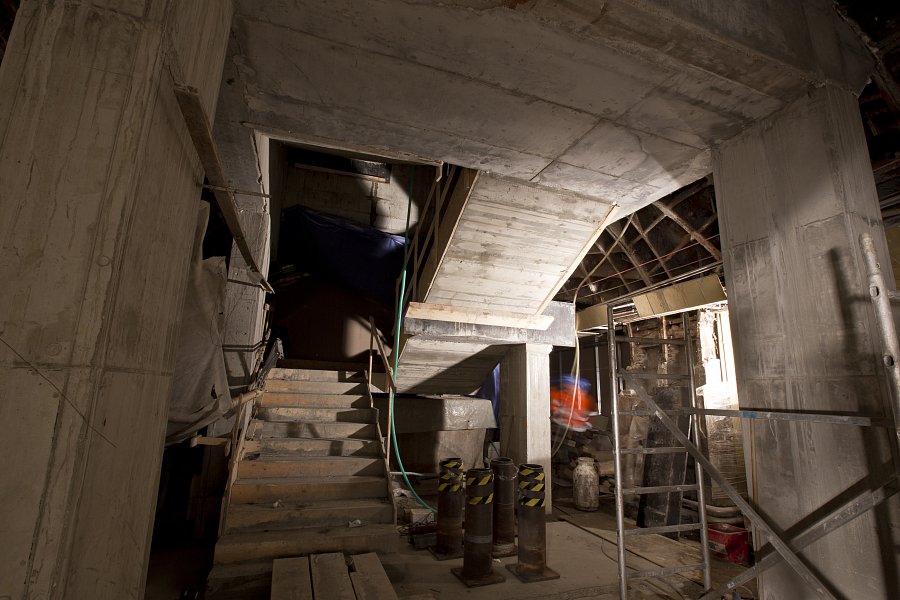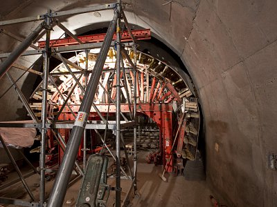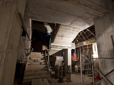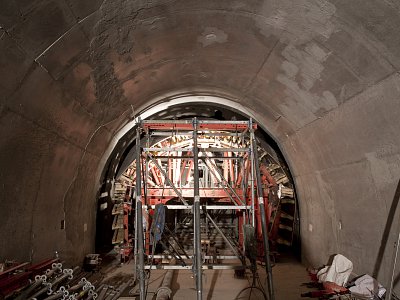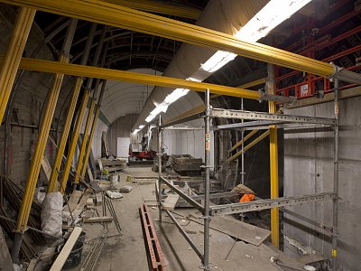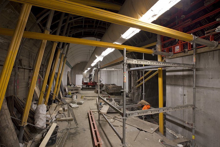Realizační tým musel vybudovat dvě svislé, přibližně 25 m, hluboké, šachy, z nichž jedna sloužila pouze jako těžní a montážní šachta v průběhu realizace, druhá byla osazena dvojicí výtahů vedoucích do podzemí. Na výtahy vedoucí z povrchu Václavského náměstí navázala ražba přístupových tunelů pro spojovací výtah mezi stanicemi linky A a linky B, který zajišťuje bezbariérový přístup až na nejspodnější nástupiště. Veškeré práce v podzemí byly realizovány tzv. Novou rakouskou tunelovací metodou, kdy po otevření výrubu bylo provedeno primární ostění ze stříkaného betonu a dalších zajišťovacích prvků. Poté bylo dokončeno souvrství mezilehlé izolace a následovala výstavba sekundárního, tedy trvalého, ostění této podzemní stavby. Komplikace stavby spočívala v již zmiňovaném situování staveniště v samém srdci metropole na Václavské náměstí, kde platí řada omezení. Pracovníci museli zohlednit veškeré existující podzemní sítě a vedení, od tubusů metra až po kolektory a kanalizace, které se v tomto místě nacházejí, a v neposlední řadě se vypořádat také se složitými geologickými podmínkami a celkově velmi technicky náročnou a tvarově komplikovanou stavbou. Stavební práce zároveň nesměly omezit provoz ve stanici metra a jejich hlavní část tedy probíhala v době mezi půlnocí a čtvrtou hodinou ranní, kdy metro není v provozu. Zajímavostí je, že veškerý materiál musel být do podzemí vnášen ručně po eskalátorech. |