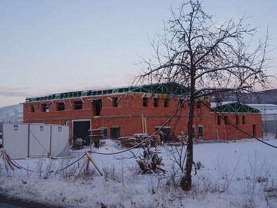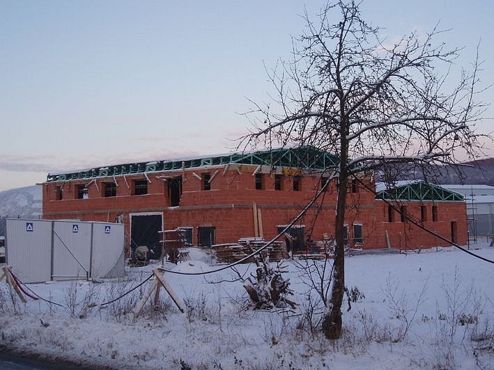 | Description: | The total built-up area of the object comprises 800 m², of which the administrative part takes approx. 190 m². The new hall will have dimensions of approx. 33x24 m and an enclosure of 5,270 m³. There will be ten parking lots available for both employees and business partners coming from more distant villages and towns. Reinforced concrete foundation plate with footings and strips will be protected by a timber roof truss. We used Alkorplan membrane as roofing material and 400 mm thick POROTHERM for external cladding. The wire mesh fencing with plastic coating shall protect the hall against thieves. |