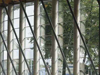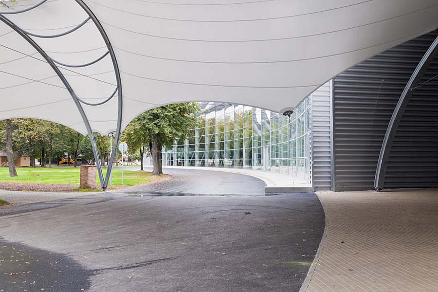 Multi-purpose pavilion serves as a monumental gateway to the premises of the exhibition grounds in České Budějovice. The building is characteristic mainly of a facade in a shape evoking a turbine sector, which consists of a folded metal cladding of profiled sheets, round holes and with membranes that are placed in front of the facade and stretched on steel ropes in a form of turbines' blades that have a shielding function.