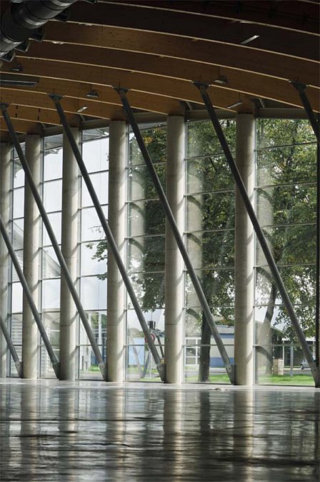 The pavilion building is divided into three functional wholes: T1 hall, T2 hall and interconnection/starting indoor premises. The main area of the T1 and T2 halls consists of the multifunction area with an exhibition function, possibly for sports or social event purposes. The actual exhibition halls were designed, according to the investor’s requirement as open areas for placement of as many exhibitors as possible, with a possibility of connection to the networks in specified places and at the same time also with a possibility of a universal use of the area in the out-of-exhibition season. The interconnection of the T pavilion with the Z pavilion is formed of a membrane structure which is drawn up to the terrain level in some places. The pavilion was designed on an orthogonal ground plan with dimensions of approx. 150 m in the east-west direction, 50 m in the north-south direction, and in the transversal direction it has a half-ellipse shape. The longitudinal cut of the building forms an offset arch. The road roundabout closely follows up to the entrance gate leading to the exhibition centre facility. That is why an open but roofed starting area arose in the place of the entrance into the facility. It is possible to enter from it directly to the T pavilion and is optically extended by way of membrane roofing up to the entrance into the Z pavilion. A membrane drawn to the gate is installed in the direction from the facility above the entrance area and forms the covered starting area for visitors. The clear height of the hall is 9 m in the topmost points of edge fields of the pavilion. It slightly grows from these points and culminates at a value of 11.4 m in the ground plan centre of the T pavilion. The bearing structure of the pavilion consists of wooden beams installed transversally at the axial distance of 4.0 m, placed on raised concrete footings and columns, steel bracing, connection elements. The membrane roofing of the building fluently passing into the facade is composed, metallic – made of profiled metal sheet installed in an interlocking pattern in a transversal direction of the volume of the building. The entire structure is thermally insulated with mineral insulation. The northern facade is formed of an integral facade cladding which is perforated in the places of window and door holes. The southern facade which arose by the cutting out is glazed. Membranes stressed on a steel structure in a slight offset from the facade are placed above the glass facade from the external side and provide shading against southern, eastern as well as western sunshine. The eastern facade in the shape evoking a turbine of its cut-out is formed of a round overlapping of the roof forming the facade lining, composed metal cladding made of profiled metal sheet, circular holes and upstream membranes stressed on steel ropes in the form of turbine blades, performing a shading function. The western facade is designed functionally, it is also formed of a composed metal cladding of profiled metal sheet in which a longitudinal window hole of a rectangular shape is placed, which passes, in the central part into the sliding gate and forms a T letter symbol in the facade. |