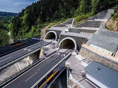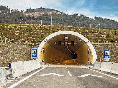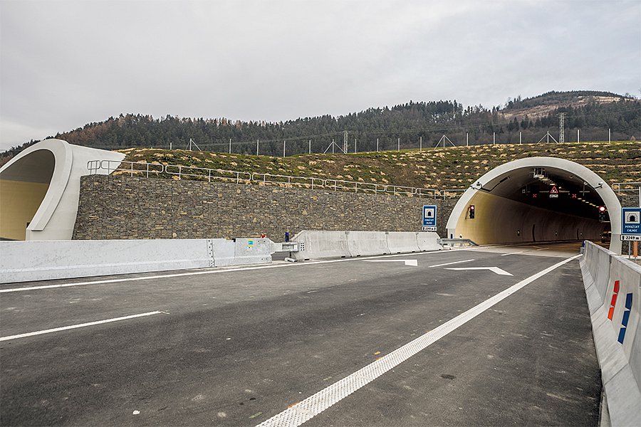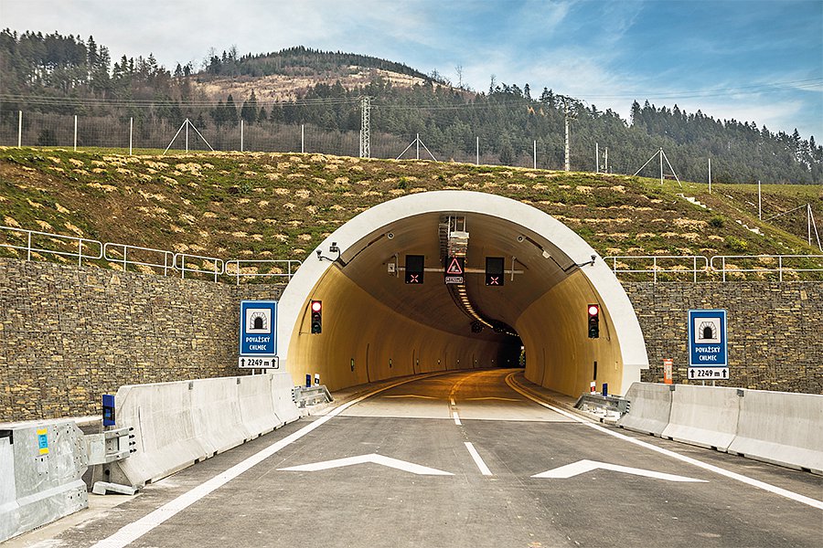 Together with two elevated road systems, one of which overcomes, on its 57 pillars, the adjacent Hričov dam, and the other one overcomes the Kysuca river, the tunnel is a part of the 4.25 km long Žilina ring road system. The matter concerns an absolutely new D3 motorway section, which increased the fluency as well as speed of the road traffic operation in the north-south direction and thus it improved the connection of Bratislava to Poland and the Czech Republic. The inhabitants of Žilina appreciated especially reduction of noise and emissions in the areas through which the traffic was passing until the construction of the new ring road system. The tunnel was unique already during its construction. With regard to the tight time schedule and among other things also the small height of the overburden, a building pit was excavated approximately in the middle of the tunnel route, and this building pit subsequently made it possible to open other workplaces. The driving by using the New Austrian Tunnelling Method was therefore performed from up to 8 tunnel headings at the same time, with the use of 35 machines and lasted for 11 months only in spite of the fact that the volume of the rock removed achieved up to 390,000 m³. In spite of the extent of the construction works it was possible to minimise the environmental load of the works. The sealing of the building pit with fly ash for example in the adjacent valley supported the natural renewal of the ground water regime. And local people confirmed (already several days after the work completion) that wild animals started to return to the area above the tunnel. Most technological equipment was only installed in the tunnel after the laying of the cement-concrete coverage of the road, i.e. in the very last phase of the construction. It makes Považský Chlmec one of the safest tunnels in Europe and only the third tunnel in Slovakia in which also transport of dangerous goods is to be permitted (each vehicle with dangerous goods must be visibly signed and the cameras on the tunnel portals scan and register these signs). The video control system detects automatically also the risk situations which may be represented in the tunnel for example by wild animals, walkers, slowly going or stopped vehicles, vehicles in the opposite direction, suddenly reduced speed of a line of cars or lost cargo. Other safety systems of the tunnel include fire ventilation, hydrants, tunnel public address system, warning illumination or smoke detectors thanks to which it is possible to observe development of smoke in the tunnel. The entire construction was completed, including the drawing up of the design documentation, in 40 months, and at one moment there worked as many as 240 workers. HOCHTIEF CZ executed the project as the technical leader of the consortium. Považský Chlmec in numbers: