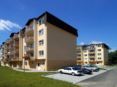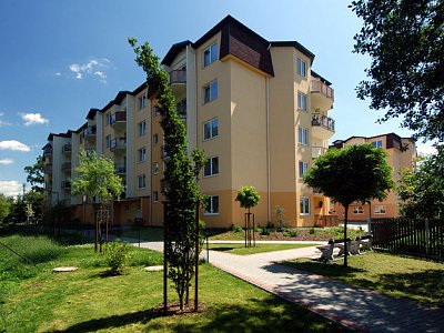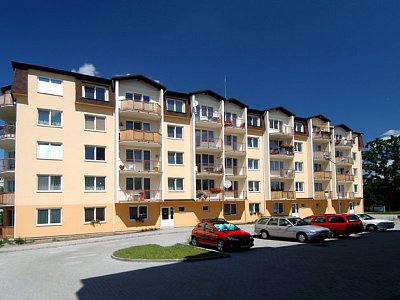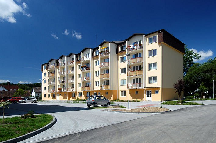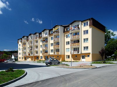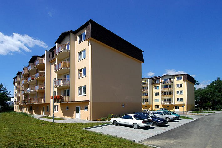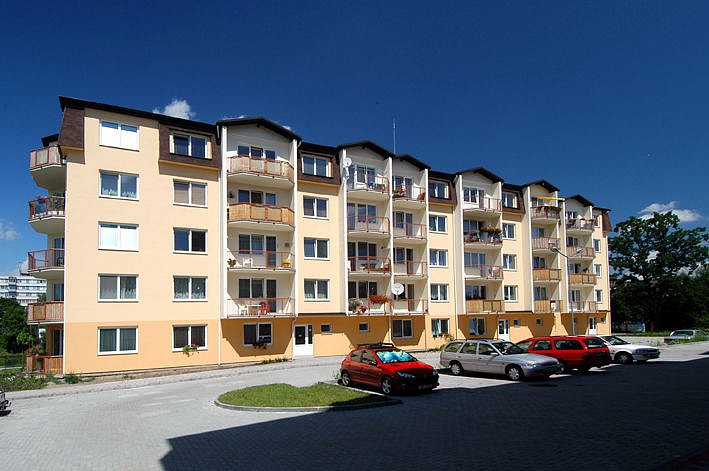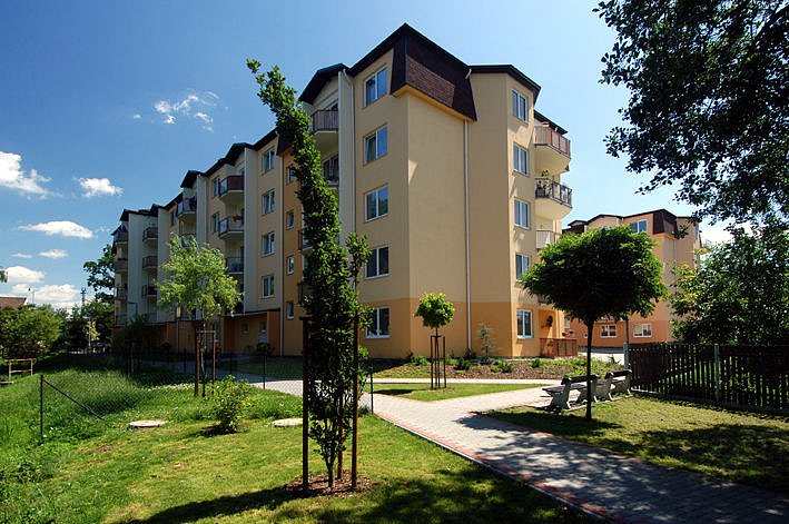 The residential complex consists of terraced apartment houses divided into three sections. All of them have five aboveground storeys; the last of them has the character of a mansard, in particular with regard to the surrounding development. The mansard covered with asphalt shingle optically decreases the height of the building. From the technical point of view, the construction has characteristic features of company standardisation of technologies for apartment buildings. Vertical load-bearing elements of Porotherm are completed with precast lattice girder plates with additional pouring of concrete. |