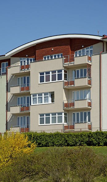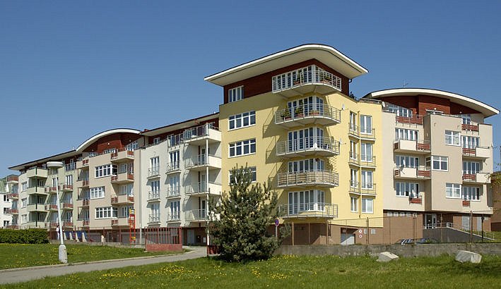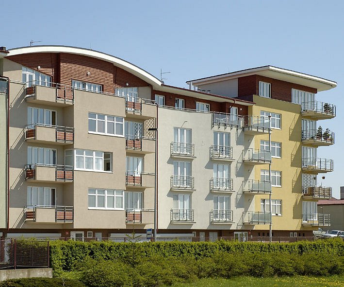 The building in question, together with other buildings, creates an apartment complex in the southern part of the street Za Černým Mostem. The apartment block is divided into 4 buildings. The first section is designed for office purposes; the other sections have a residential character. On the ground floor there are garages and technical rooms, from the 1st floor to the 4th floor there are apartments.