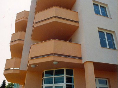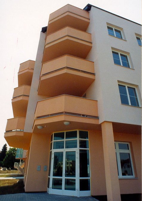 | Description: | Situated in Tábor opposite the district hospital, this is a building of five aboveground and one underground storey. It is founded on strip foundations and footings. Vertical and load-bearing structures are of brickwork, in some parts completed with reinforced concrete columns. Horizontal structures are formed by lattice girder plates completed with cast-in-situ concrete and reinforcement to the thickness of 200 mm. On the eastern and western side of the building there is, along the whole height, a glazed strip of balconies, providing the rooms with conservatories. On the first aboveground storey the clients can visit a chapel. The surroundings of the building are completed with soft landscaping with benches and an arbour on the western side of the building. New hard surfaces and roads are linked to surrounding areas and they enable a comfortable access to the building. |