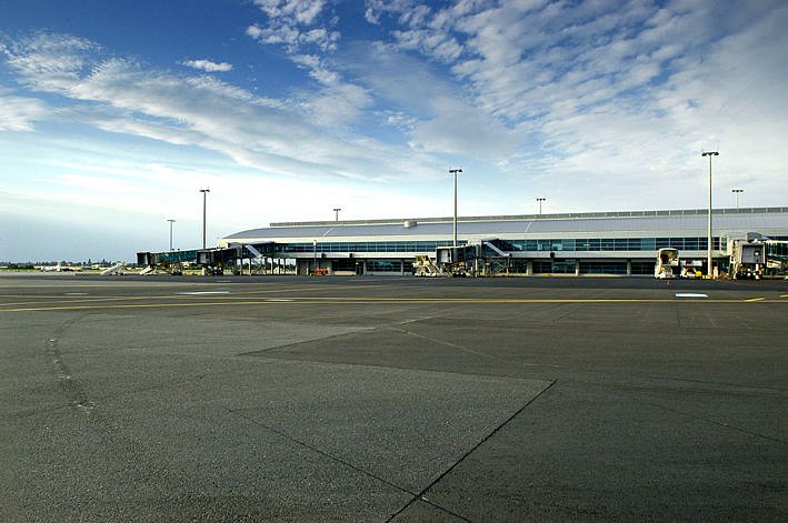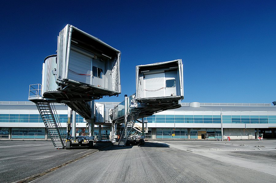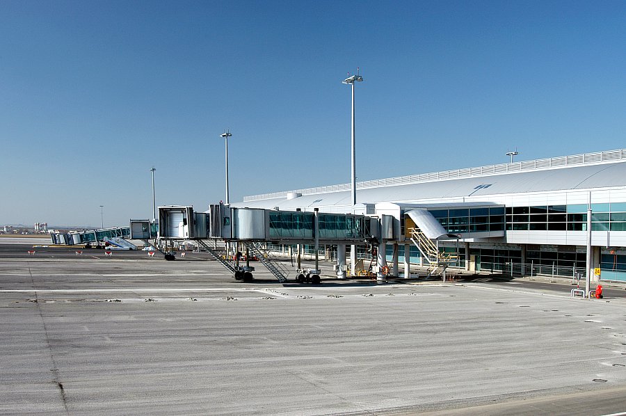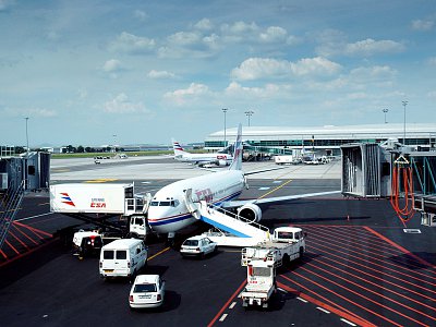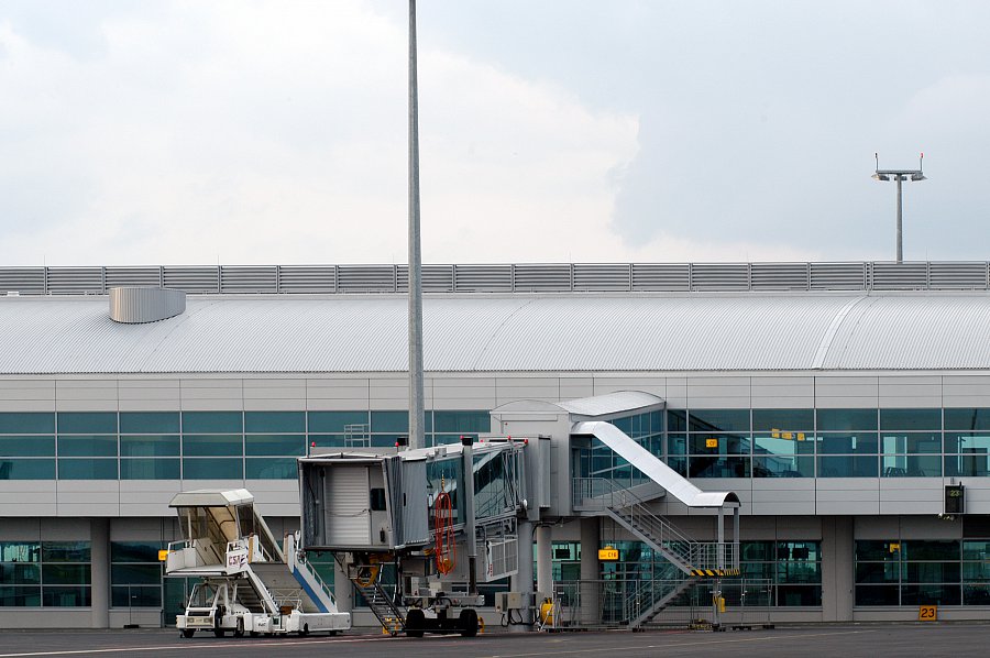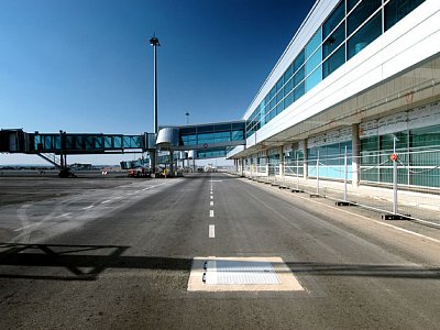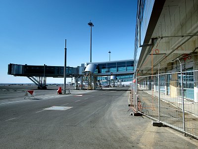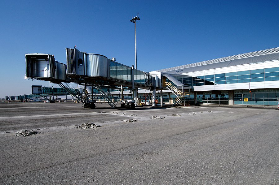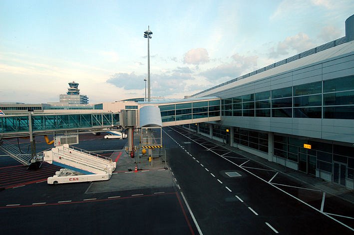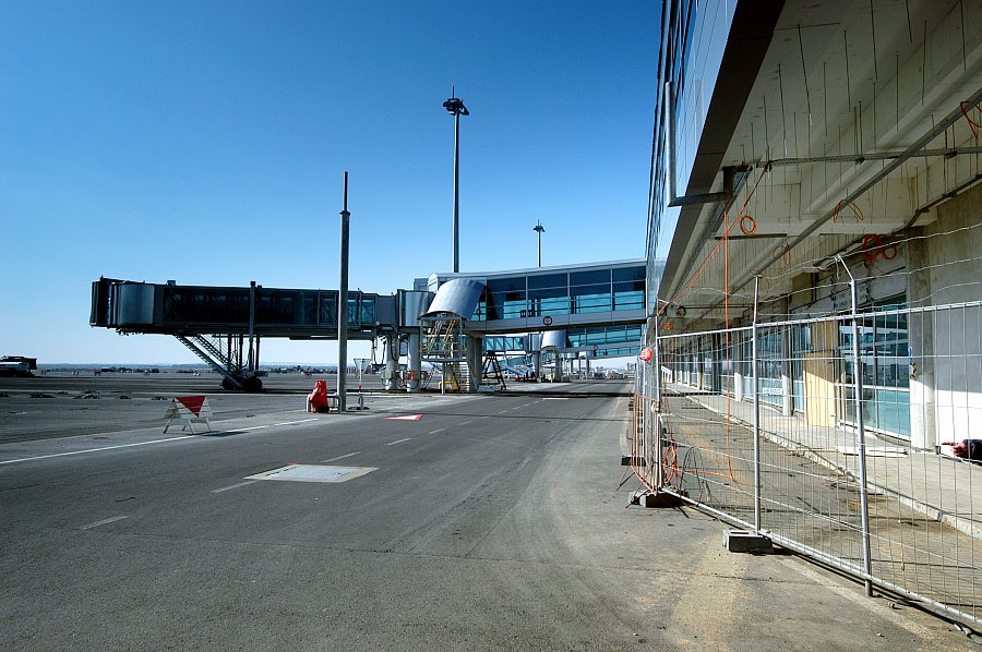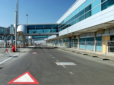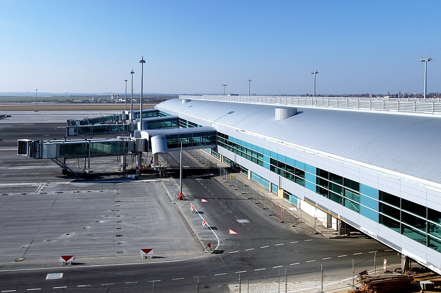 The cladding is partially a glazed façade, partially aluminum sheet (about 50:50). Finger C is equipped with ten boarding bridges with their own motors. Part of the Finger C project is the construction of a main services duct which runs along the connecting neck, Terminal 2 North and further along the handling area. (Perpendicular to the longitudinal axis of Finger C, on the dividing line between Finger C and Terminal 2 North). Its basic data: length about 330 m, rectangular section 2.1 by 2.4 m, thickness 300 mm, average depth of the duct bottom is 6.5 m. The duct is carried out as a reinforced poured in-situ structure of impermeable concrete, founded on a layer of compacted gravel sand and a layer of lean concrete.