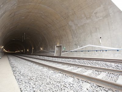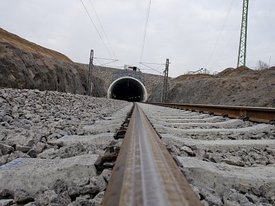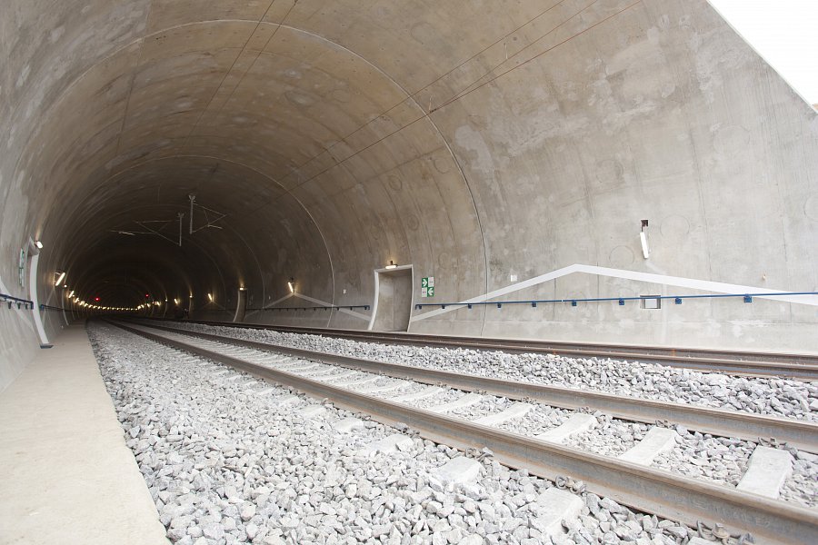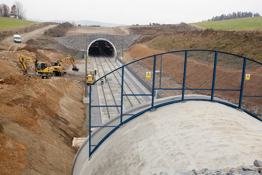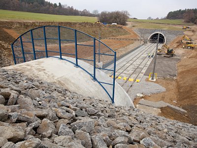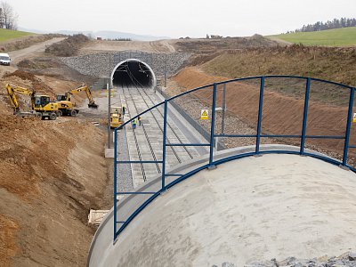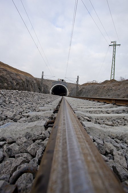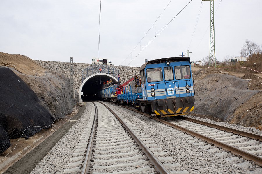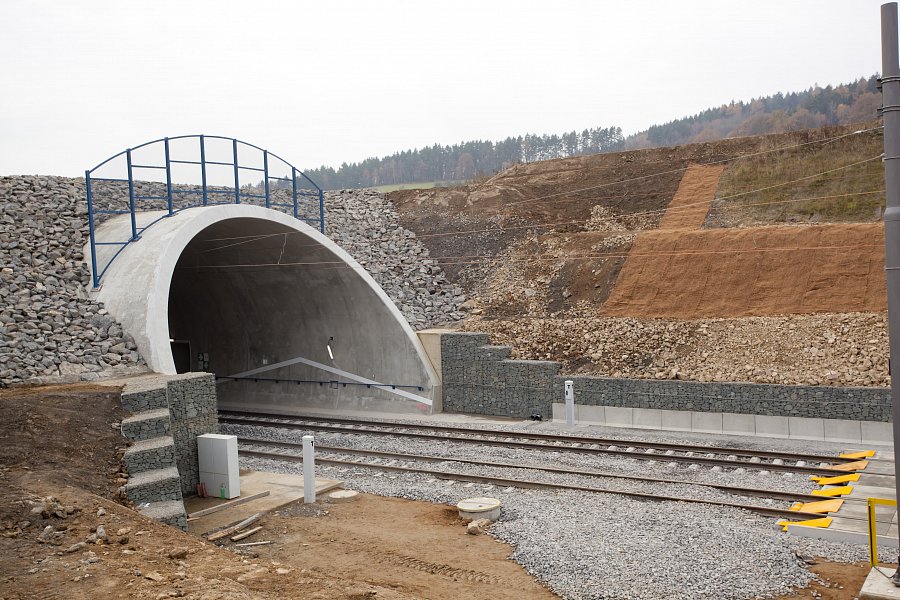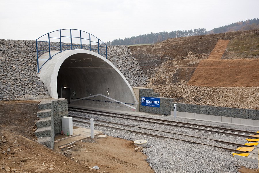 | Popis | Jedná se o 590 m dlouhý hloubený dvoukolejný tunel. Konstrukce je klenbová, uložená na patkách, postavená z vodonepropustného betonu. Tunel je členěn na 10 m bloky s výklenky po 20 m. Výška nadloží 2–8 m. Maximální hloubka stavební jámy je 18 m. Celkový objem výkopových prací 150 000 m3. Modernizací trati bylo dosaženo zvýšení maximální možné průjezdné rychlosti až na 160 km/h. Během hloubení stavební jámy jsme se museli vypořádat s nepříznivými geotechnickými podmínkami – několikrát došlo ke změně zajištění stavební jámy. Z důvodu nestability zářezu a nebezpečí uvolňování skalních bloků bylo přistoupeno k zajištění nejen kotvami, ale i vysokopevnostními sítěmi a stříkaným betonem v celé délce zářezu. K hloubení stavební jámy byla kromě trhacích prací a běžné techniky použita i skalní fréza. Originální je konstrukce betonového ostění tunelu, které je ve spodní části rozepřeno o skalní masiv. To umožnilo snížení tloušťky ostění na 500 mm. Konstrukce je navržena z betonu C25/30 XC2, XF1 příp. C30/37 XC2, XF3 (portály) odolného proti průsakům bez nutnosti použití další izolace. K betonáži byla použita oboustranná těžká tunelová forma. Výztuž byla navržena jako samonosná (montované rámy), byla vázána v předstihu. Odvodnění tunelu je zajištěno systémem vnějších a vnitřních drenáží. V tunelu je dále osazen požární suchovod pro případ havárie. |