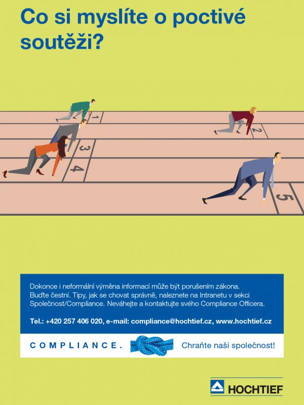 V rámci skupiny HOCHTIEF platí závazná pravidla. Všichni zaměstnanci jsou povinni jednat v souladu s těmito pravidly, která jsou definována v Etickém kodexu společnosti HOCHTIEF a v interních předpisech. Důraz je kladen na poctivost a čestnost. Totéž očekáváme od svých smluvních partnerů a subdodavatelů. Jsme nekompromisní, pokud dojde k jakémukoliv jejich porušení. Naši zaměstnanci jsou pravidelně proškolováni.