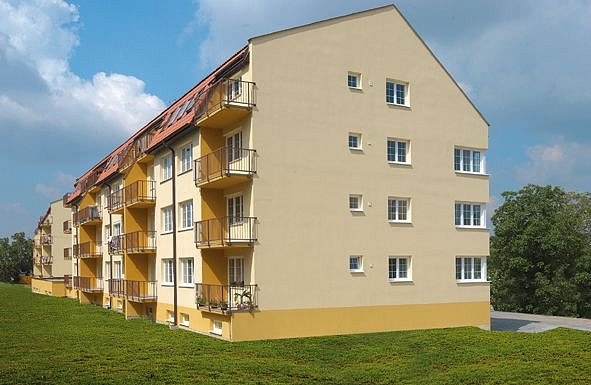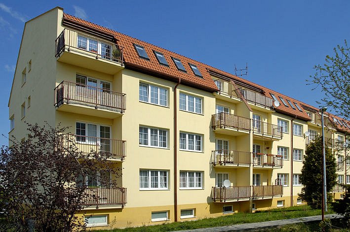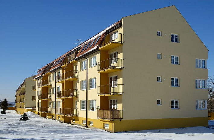 | Popis | Obvodová konstrukce objektu je navržena ze systému Porotherm. Vnitřní nosné konstrukce jsou navrženy slabší než obvodová konstrukce. V suterénu jsou vnitřní nosné zdi navrženy z plných cihel. Pilíře mezi garážovými vraty jsou monolitické, železobetonové. Vnitřní schodiště ve společných prostorách je dvouramenné, železobetonové, monolitické, se zrcadlem. Střešní konstrukce je navržena jako sedlová, zalomená. Střešní krytina je ze systému Meindl, vlnovka Romano.V polozapuštěném podlaží se nachází technické zázemí objektu jako je strojovna ÚT, sklepní kóje, úklidová místnost, sušárna, místnost pro kočárky a kola, garáže pro zhruba 14 osobních automobilů. Každou sekci tvoří 12 bytů. |