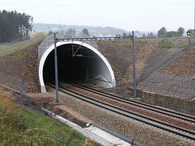 | Popis | Tunel Osek je hloubený, dvoukolejný železniční tunel o délce 324 m. Je veden v oblouku s poloměrem 747,805 m (v ose tunelu). Ve vrcholu je železobetonová konstrukce tunelu přesypaná o 1,0 m. Práce na tunelu byly zahájeny hloubením stavební jámy v polovině září 2009. Celkový objem výkopů činil 52 000 m3. Svahy stavební jámy byly až na úroveň základové spáry tunelu zajištěny stříkaným betonem vyztuženým ocelovými sítěmi a hřebíky. Největší hloubka stavební jámy je 13 m. Vyjma portálových pásů je ostění tunelu provedeno jako dvouplášťové s mezilehlou foliovou izolací. Vnější ostění o délce 300 m (falešné primární ostění) slouží jako ztracené bednění a ochrana izolace proti vodě. Primární ostění je ze stříkaného betonu C20/25 tl. 300 mm, vyztuženého ocelovými příhradovými rámy a sítěmi. Vnější ostění je provedeno na rozšířené základové pasy pro definitivní ostění. Po provedení falešného primárního ostění proběhl následný pracovní postup jako při provádění raženého tunelu, tj. provedení hydroizolačního souvrství, montáž výztuže definitivního neboli sekundárního ostění a betonáž definitivního ostění pomocí bednícího vozu. Definitivní ostění je z monolitického železobetonu C25/30, minimální tloušťky 350 mm. Portálové tunelové pásy se šikmými čely jsou provedeny do oboustranného bednění, tloušťka ostění je minimálně 500 mm. Tunel je rozdělen na 25 tunelových pasů a dva portálové úseky. Tunelový pas má délku 12 m a hmotnost uložené výztuže do jednoho tunelového pasu je cca 11 t. V každém druhém tunelovém pasu je po obou stranách proveden záchranný výklenek. Celkem bylo uloženo do definitivního ostění 3 565 m3 betonové směsi. |