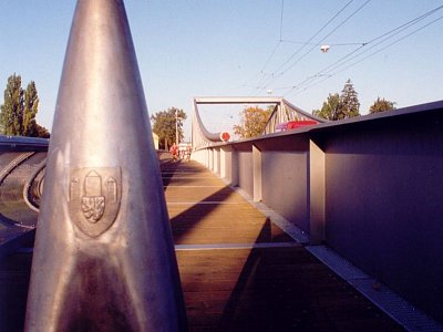 | Popis | Nový ocelový most má dvě pole. Hlavním nosným systémem je visutý most s vyztuženým nosníkem a dolní železobetonovou mostovkou, která je spojena s příčníky pomocí ocelových trnů. Visutým prvkem je předpjatý kabel firmy Diwydag, umístěný při horním obrysu v ocelové trubce.Ochrana proti korozi je provedena kombinovaným ochranným povlakem včetně metalizace. Hydroizolace je jednopásová z modifikovaného asfaltu, odvodnění mostu je z nerezového potrubí a kryt chodníku je z dubového dřeva. Mostní opěry a středový pilíř jsou ze železobetonu se vzhledovou úpravou přirozeného hladkého betonu. Okraje mostu jsou upraveny jak pro pěší, tak i pro cyklisty. |