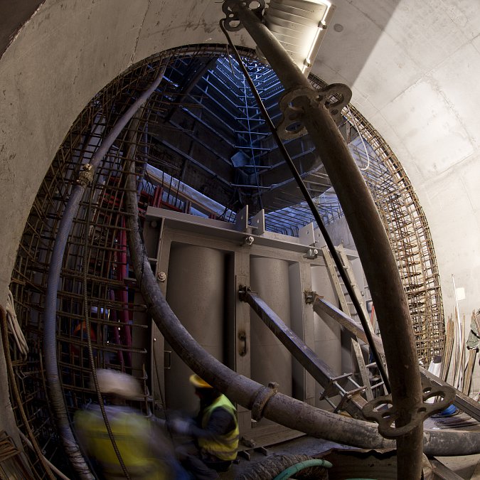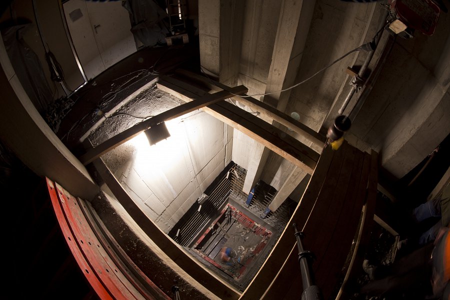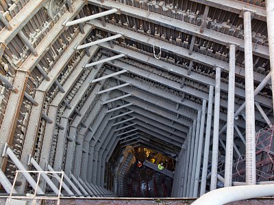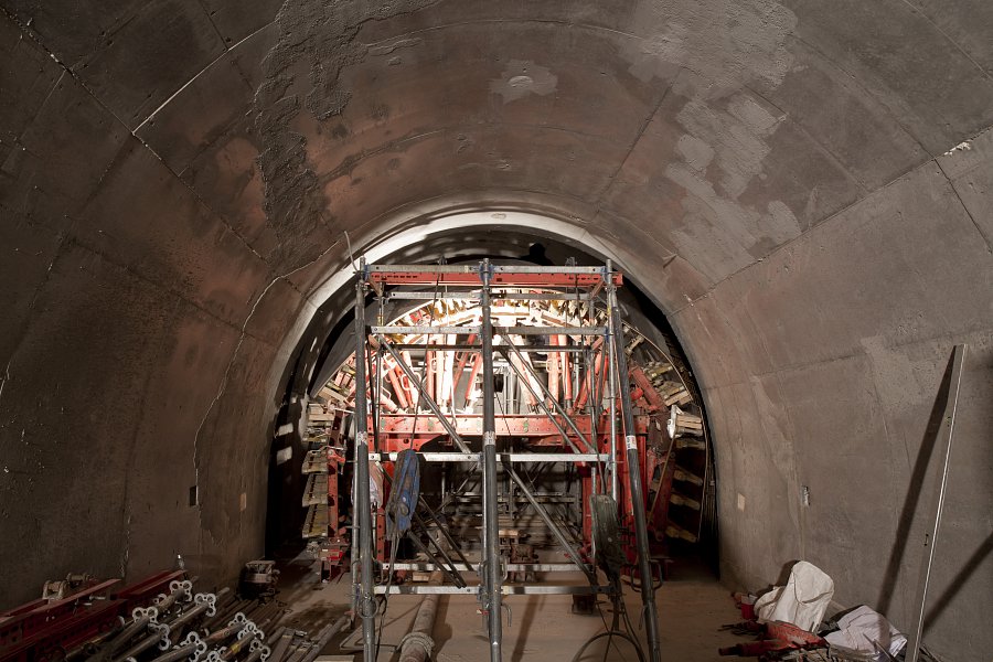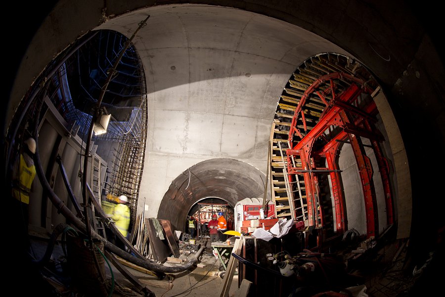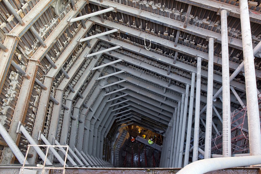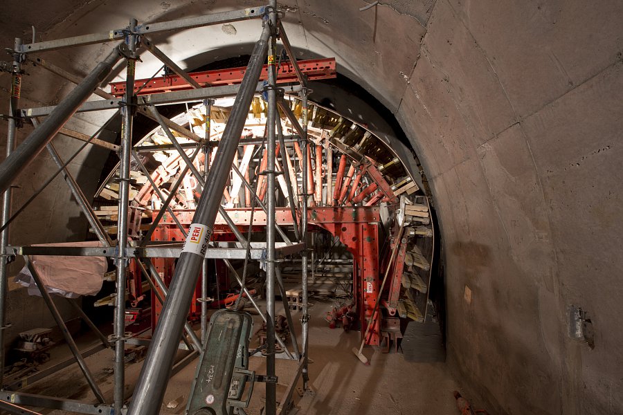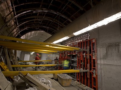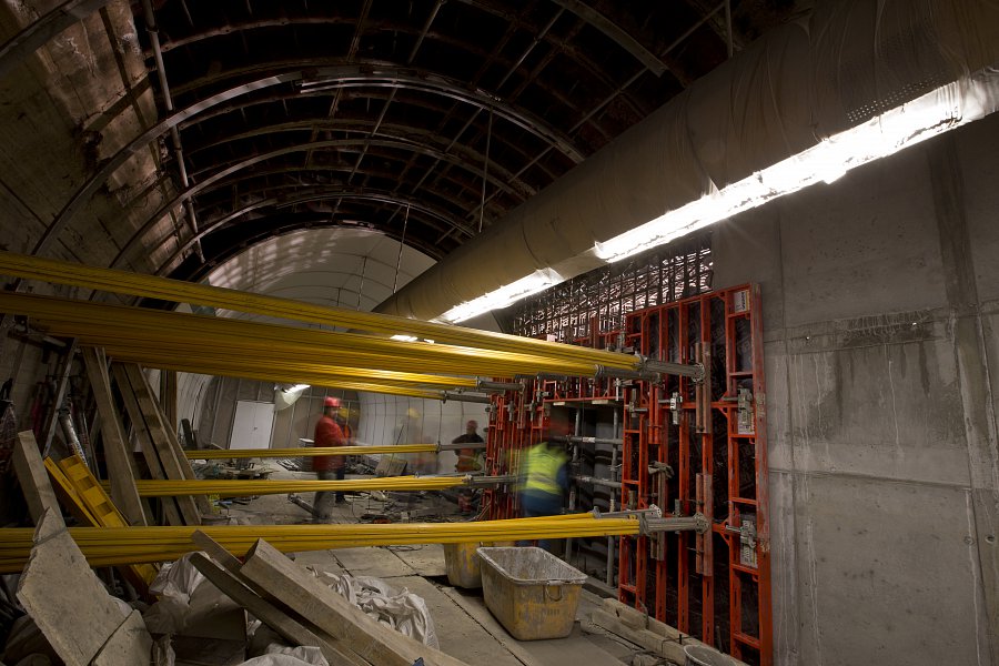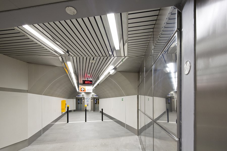 Realizační tým musel vybudovat dvě svislé, přibližně 25 m, hluboké, šachy, z nichž jedna sloužila pouze jako těžní a montážní šachta v průběhu realizace, druhá byla osazena dvojicí výtahů vedoucích do podzemí. Na výtahy vedoucí z povrchu Václavského náměstí navázala ražba přístupových tunelů pro spojovací výtah mezi stanicemi linky A a linky B, který zajišťuje bezbariérový přístup až na nejspodnější nástupiště. Veškeré práce v podzemí byly realizovány tzv. Novou rakouskou tunelovací metodou, kdy po otevření výrubu bylo provedeno primární ostění ze stříkaného betonu a dalších zajišťovacích prvků. Poté bylo dokončeno souvrství mezilehlé izolace a následovala výstavba sekundárního, tedy trvalého, ostění této podzemní stavby. Komplikace stavby spočívala v již zmiňovaném situování staveniště v samém srdci metropole na Václavské náměstí, kde platí řada omezení. Pracovníci museli zohlednit veškeré existující podzemní sítě a vedení, od tubusů metra až po kolektory a kanalizace, které se v tomto místě nacházejí, a v neposlední řadě se vypořádat také se složitými geologickými podmínkami a celkově velmi technicky náročnou a tvarově komplikovanou stavbou. Stavební práce zároveň nesměly omezit provoz ve stanici metra a jejich hlavní část tedy probíhala v době mezi půlnocí a čtvrtou hodinou ranní, kdy metro není v provozu. Zajímavostí je, že veškerý materiál musel být do podzemí vnášen ručně po eskalátorech. |
