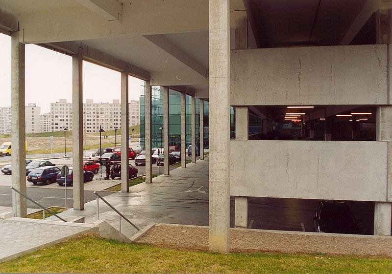 | Popis | Kryté parkovací stání má jednoduchý půdorys 80,6 x 60,25 m. Nad střešní rovinou vystupují pouze 2 přístřešky skleněné terčové fasády únikových schodišť. K objektu vedou 2 vjezdy, jeden z jihu na úroveň 1. nad- zemního podlaží a druhý ze severu na úroveň 4. nadzemního podlaží (střecha). Jednotlivá patra od 1. až po střechu objektu jsou vzájemně propojena 2 rampami na každém podlaží, které jsou situovány vně, podél delších stran objektu.