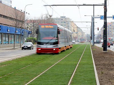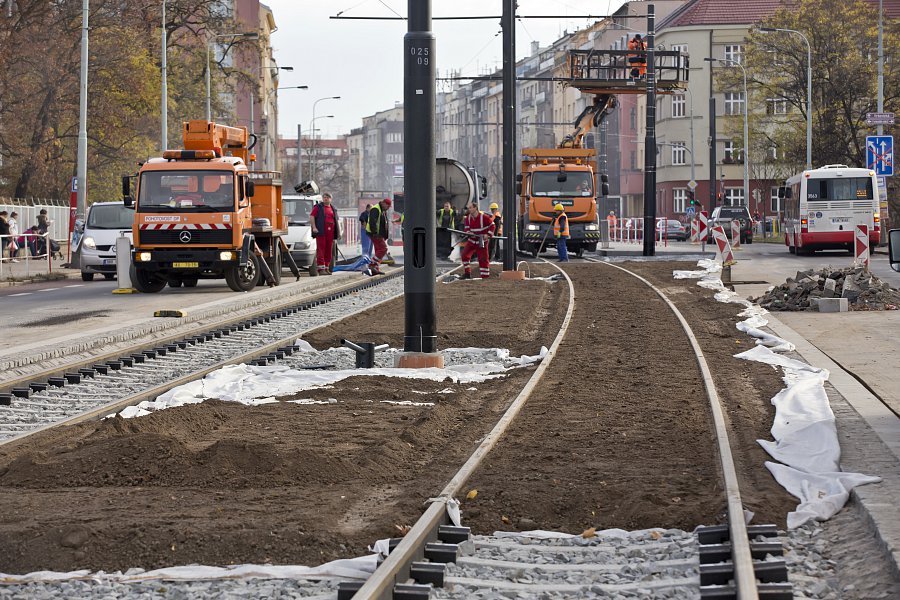 Cestující v pražské čtvrti Vršovice se těší po opravě z tiché trati se spoustou moderních úprav. Část tratě je zatravněna a jsou na ni bezbariérové zastávky. V počáteční fázi bylo provedeno vytrhání kolejnic, kolejových panelů a obrub, frézování a výkop původních konstrukčních vrstev. Dále odkop na zemní pláň, sanace neúnosného podloží. Po provedení drenáže jsme zrealizovali nové konstrukční vrstvy, otevřené kolejové lože s travní úpravou případně cementobetonovým krytem. Rekonstrukce tramvajové tratě probíhala ve velmi hustě obydlené a frekventované části Prahy, a byla proto náročná na logistiku a rychlost postupu prací. Projekt zahrnoval i částečnou úpravu vozovek, chodníků a rekonstrukci pěti tramvajových zastávek. Technicky a koordinačně nejnáročnější byla rekonstrukce vytížené křižovatky Vršovická – Bělocerkevská, která byla realizována za částečného provozu a v pouhých deseti dnech. |