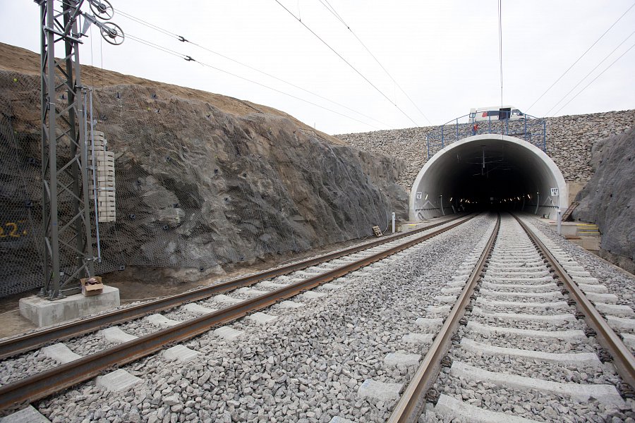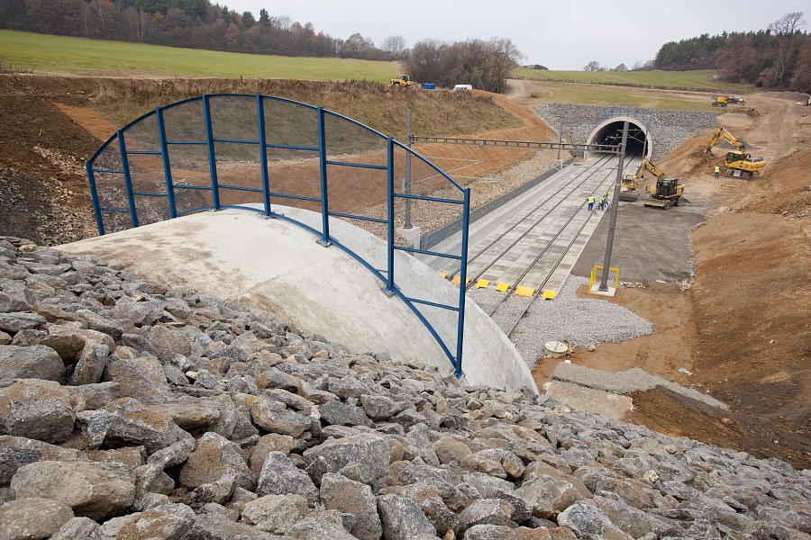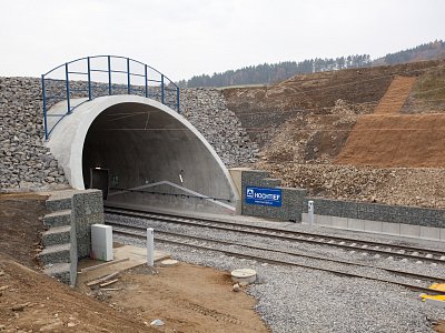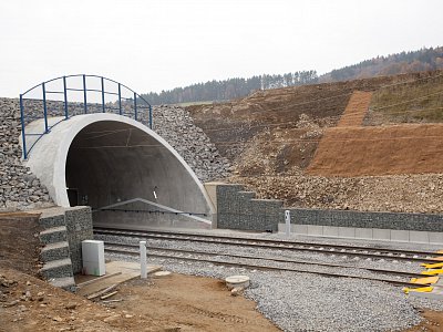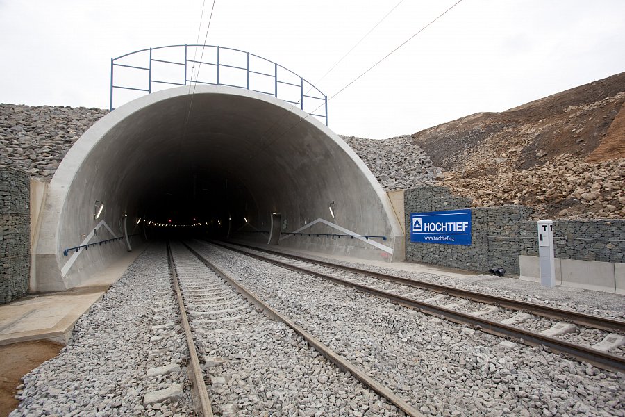 Jedná se o 590 m dlouhý hloubený dvoukolejný tunel. Konstrukce je klenbová, uložená na patkách, postavená z vodonepropustného betonu. Tunel je členěn na 10 m bloky s výklenky po 20 m. Výška nadloží 2–8 m. Maximální hloubka stavební jámy je 18 m. Celkový objem výkopových prací 150 000 m3. Modernizací trati bylo dosaženo zvýšení maximální možné průjezdné rychlosti až na 160 km/h. Během hloubení stavební jámy jsme se museli vypořádat s nepříznivými geotechnickými podmínkami – několikrát došlo ke změně zajištění stavební jámy. Z důvodu nestability zářezu a nebezpečí uvolňování skalních bloků bylo přistoupeno k zajištění nejen kotvami, ale i vysokopevnostními sítěmi a stříkaným betonem v celé délce zářezu. K hloubení stavební jámy byla kromě trhacích prací a běžné techniky použita i skalní fréza. Originální je konstrukce betonového ostění tunelu, které je ve spodní části rozepřeno o skalní masiv. To umožnilo snížení tloušťky ostění na 500 mm. Konstrukce je navržena z betonu C25/30 XC2, XF1 příp. C30/37 XC2, XF3 (portály) odolného proti průsakům bez nutnosti použití další izolace. K betonáži byla použita oboustranná těžká tunelová forma. Výztuž byla navržena jako samonosná (montované rámy), byla vázána v předstihu. Odvodnění tunelu je zajištěno systémem vnějších a vnitřních drenáží. V tunelu je dále osazen požární suchovod pro případ havárie. |