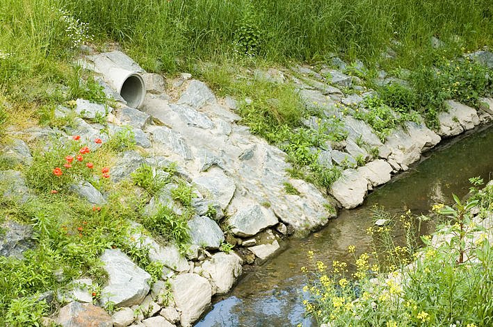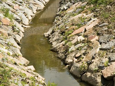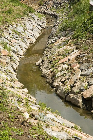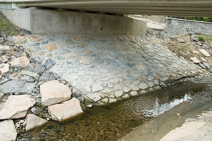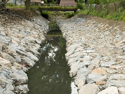Břehy koryta jsou ohumusovány a osety travou. V některých úsecích je úprava koryta provedna s protipovodňovými ochrannými betonovými parapetními zídkami případně pravoúhlými ochrannými zdmi v celkové délce cca 1500 m. Jde o úseky, kde pobřežní vlastníci pozemků mají své pozemky až po hranu koryta a ochrana jejich pozemků není jinak možná. |
