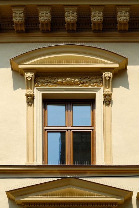 Vnější vzhled budovy zůstane stejný, bohatá štuková výzdoba bude na chybějících místech pouze doplněna. Omítka bude ve světlém okrovém odstínu, aby respektovala historickou povahu domu. Objekt dostane plastová okna v takové úpravě, která bude ladit s jeho celkovým vzhledem – včetně nahrazení původních výkladních skříní v přízemí. Během rekonstrukce budou vyztuženy stropy a provedeny nové podlahy a podhledy. Téměř všechny příčky budou nově vybudované. Nad terasou bude položena nová střecha a objekt také získá nové rozvody veškerých instalací. |