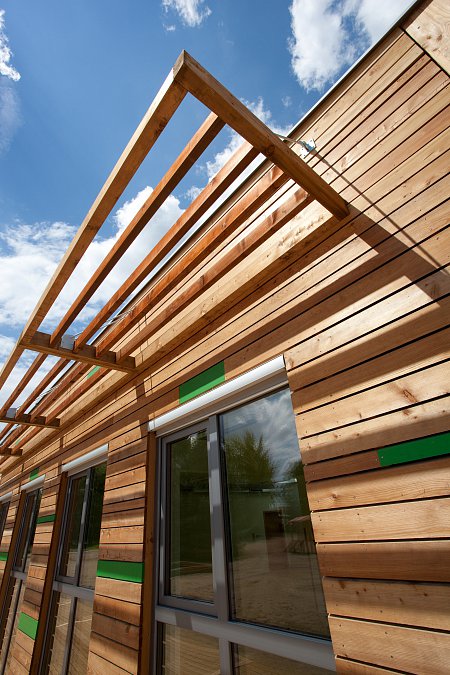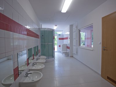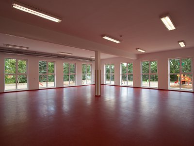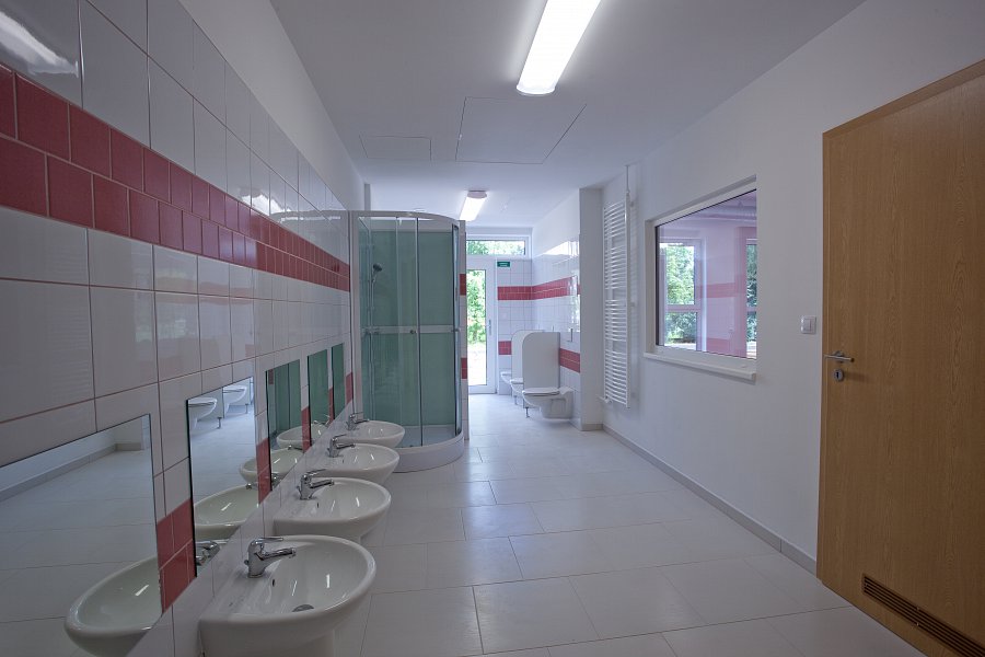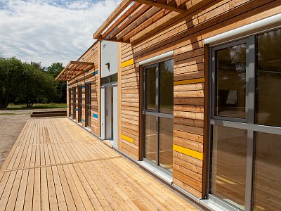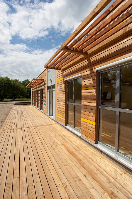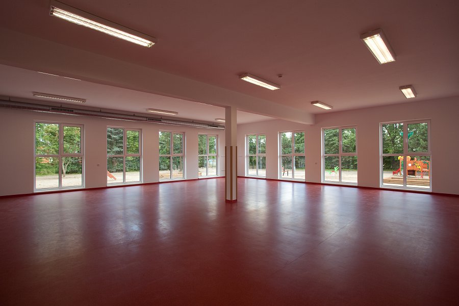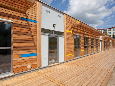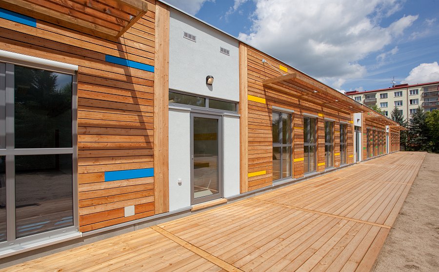 Dosluhující a nevyhovující objekty mateřské školky byly odstraněny a na jejich místě vyrostla nová, jednopodlažní budova. Návrh nové stavby pochází z architektonického ateliéru Masák & Partner a vycházel ze dvou nutných principů. Prvním principem byl požadavek na energeticky úsporné pojetí, který také souvisí s neobvykle vybraným konstrukčním systémem dřevostavby. Druhým, stejně důležitým principem, byl požadavek na jednoduché a funkční provozní uspořádání objektu. Propojením zmíněných požadavků vznikla velmi kompaktní a zároveň čitelně strukturovaná stavba. Z hlediska dispozice a organizace vnitřního provozu je objekt tvořen sestavou dvanácti prostorových modulů, kde každému z nich je přiřazena jasná funkce. Tyto jsou vzájemně propojeny sítí prostorů, jimž je kromě funkce komunikační přiřazena ještě funkce doplňková (např. úložné prostory hraček, hygienická zázemí apod.). Moduly po obvodě stavby jsou věnovány zejména pro pobytové místnosti dětí (např. herny, lehátkové části) a jeden severní modul je navržen jako kuchyně se zázemím. Pro zajištění snadné orientace dětí jsou jednotlivé pavilony pojednány barevně (každá herna má vlastní barvu). Jádro stavby vyplňuje zázemí zaměstnanců, technické zázemí budovy a jeden otevřený prostor určený jako jídelna a společenský prostor. Dominantním prvkem fasády je obložení z modřínu bez povrchové úpravy a taky screenové rolety, které nejsou jen ozdobným doplňkem, ale v souladu s energetickou úsporností budovy zajišťují odclonění nadměrných tepelných zisků v letním období. Jídelna rovněž doznala podstatných změn. Součástí komplexní dodávky bylo také stolové vybavení varny, vše samozřejmě v nerezové oceli podle norem gastro-provozů. Nová varna disponuje také chladícími a mrazícími stroji pro správné uchovávání potravin a strojem na škrábání brambor a kořenové zeleniny, aby předškoláci měli vždy čerstvou a chutnou stravu. |