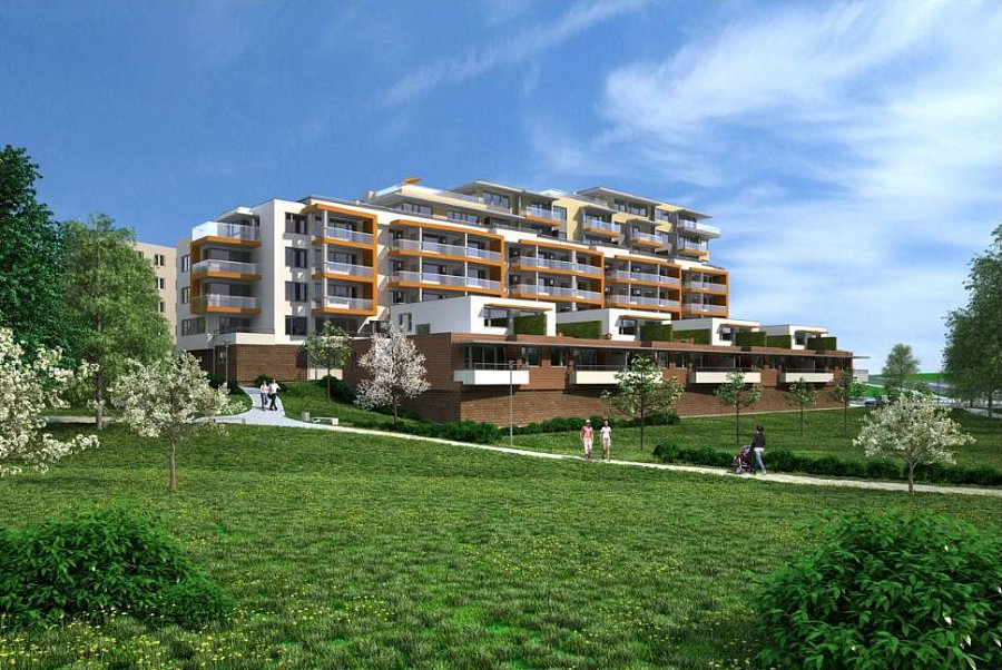 Jedná se o bytový dům, který má 1 podzemní a 8 nadzemních odstupňovaných podlaží. Spodní úrovně domu jsou věnovány garážování, vstupním prostorám, společnému domovnímu vybavení a sklepům pro byty. Bytová podlaží jsou v 2.NP až 8.NP, mezonetová ubytování mají nástup z terasy v 1.NP. Základní skladebnou jednotkou je bytová sekce, složená ze tří stavebních modulů. Každá sekce má ve středovém modulu výtah a schodiště přimknuté k severní straně půdorysu. Tato koncepce poskytuje základní sestavu bytů 1+kk, 2+kk a 3+kk. Řešení sekcí umožňuje případné, klientem vyžádané propojení předsíní bytů 1+kk a 2+kk pro získání větší bytové jednotky či dvougeneračního bytu. Dvoupodlažních mezonetové byty orientované do budoucího parku rozšiřují typologickou škálu možností bydlení v této lokalitě. Dalším stavebním objektem je Přístřešek nad parkovacím stáním – zelená střecha a je navržen tak, aby tvořil opěrnou stěnu násypu zeminy a tím vyrovnával výškový rozdíl prostoru před stávajícím bytovým domem a přístupové komunikace k polyfunkčnímu objektu. Střecha s extenzivní zelení zároveň příznivě rozšiřuje rekreační prostor s dětským hřištěm na horní úrovni. Plocha střechy bude volně přístupná a po obvodu lemována stěnou tvořícím zábradlí. |