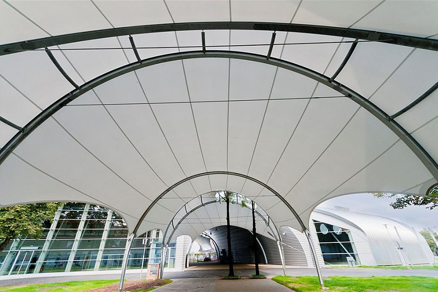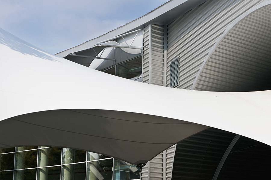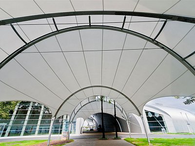 Pavilon byl navržen na ortogonálním půdorysu s rozměry cca 150 m ve směru východ-západ, 50 m ve směru sever-jih a má v příčném řezu tvar půl-elipsy odsazené kolmo od terénu, jejíž výška roste směrem ke středu půdorysu. Podélný řez objektu tvoří odsazený oblouk. Kruhový objezd komunikace zasahuje půdorysně do pravidelného obdélníkového půdorysu pavilonu a vymezuje v něm kruhový výřez v horizontální rovině. Objekt těsně navazuje na vstupní bránu do areálu výstaviště. Odečtením hmoty průchodu, který má také profil půl-elipsy a prochází kolmo objektem pavilonu, vznikl v místě vstupu do areálu otevřený, ale zastřešený nástupní prostor. Z něho je přímý vstup do pavilonu T a je opticky protažen formou membránového zastřešení až ke vstupu do pavilonu Z. Směrem z areálu je nad vstupním prostorem membrána protažená k bráně a tvoří krytý nástupní prostor pro návštěvníky. Světlá výška haly je v nejvyšších bodech krajních polí pavilonu 9 m. Z těchto bodů pozvolna roste, přičemž kulminuje na hodnotě 11,4 m v půdorysném středu pavilonu T. Nosná konstrukce pavilonu se skládá z dřevěných nosníků kladených příčně v osové vzdálenosti 4,0 m, posazených na zvýšených betonových patkách a sloupech, ocelového zavětrování, spojovacích prvků. Střešní plášť objektu plynule procházející do fasády je skládaný, kovový – z profilovaných plechů usazovaných do zámku v příčném směru hmoty objektu. Celá konstrukce je zateplená minerální izolací – střešní část izolací tl. 200mm, obvodová část tl.140mm. Severní fasádu tvoří celistvý fasádní plášť, který je perforován v místech okenních a dveřních otvorů. Jižní fasáda, která vznikla vykrojením, je prosklená. Nad skleněnou fasádou jsou zvenčí umístěny membrány pnuté na ocelové konstrukci v mírném odsazení od fasády, které stíní proti jižnímu, východnímu i západnímu slunci . Východní fasáda ve tvaru evokujícím turbínu, resp. její výseč je tvořena oblým přesahem střechy tvořícím lem fasády, skládaným kovovým pláštěm z profilovaných plechů, kruhových otvorů a předsazenými membránami vypnutými na ocelových lanech v podobě lopatek turbíny, které mají stínící funkci. Západní fasáda je pojednána funkčně, je tvořena taktéž skládaným kovovým pláštěm z profilovaných plechů, do něho je umístěn podlouhlý okenní otvor obdélníkového tvaru, který ve středu přechází do posuvných vrat a tvoří ve fasádě náznak písmena T. Vstupy do pavilonu T1 se nacházejí z prostoru krytého nástupního prostoru – hlavní vstup s automatickými dveřmi a podružný vstup v severní časti prostoru, dále v jižní prosklené fasádě dva vstupy s automatickými dveřmi, ze severní strany dva vstupy sloužící převážně vystavovatelům a ze západní strany jsou umístěna posuvná vrata – vstup pro vystavovatele, příp. pro kolová vozidla dle specifikace provozu. Vstupy do pavilonu T2 jsou z převážné části z nástupního prostoru areálu, jsou tvořeny jedním hlavním vstupem s automatickými dveřmi, podružným vstupem v severní části, šesti prostupy fasádou z téhož prostoru a dvěma nouzovými východy v severní a jižní fasádě objektu. Propojení pavilonu T s pavilonem Z je tvořeno membránovou konstrukcí, která je v některých místech dotažena až k terénu. Objekt pavilonu je dělen na tři funkční celky: hala T1, hala T2 a propojovací/nástupní krytý prostor. Hlavní prostor hal T1 i T2 tvoří multifunkční plocha s funkcí výstavní, případně pro účely sportu nebo společenské akce. Vlastní výstavní haly byly dle požadavku investora navrženy jako otevřené prostory pro umístění co největšího počtu vystavovatelů s možností připojení na sítě v určených místech a zároveň s možností všestranného využití prostoru v mimovýstavní sezóně. |