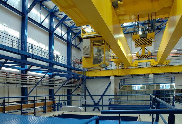 | Popis | Jedná se o jednopodlažní, jednolodní halu s kombinovaným konstrukčním systémem, který se skládá z vetknutých železobetonových sloupů a ocelové střešní konstrukce. Tuhost v příčném i podélném směru je zajištěna vetknutím železobetonových sloupů do dvoustupňových železobetonových patek a vzájemným ztužením v úrovni jeřábové dráhy, střešní konstrukce a sloupů. Na sloupech je osazena jeřábová dráha pro manipulační jeřáb 130/10t, střešní ocelové příhradové vazníky, konstrukce střechy s větracími světlíky–jedním podélným v prostoru haly a pěti příčnými v prostoru příjmové části. Objekt slouží pro příjem, přípravu pro skladování a vlastní skladování kontejnerů. Příjmová a manipulační část je prostřednictvím manipulačního a dopravního koridoru propojena vlečkovou kolejí. Železobetonový skelet objektu je ze sloupů, částečně založených na pilotách. V příjmové části jsou provedeny vestavby z železobetonových i klasických materiálů, jež jsou dále využity k provozním, skladovým, kontrolním, sociálním účelům. Dále jsou zde budovány prostory pro případné návštěvy – exkurse. Vlastní skladová část je od příjmové části oddělena stínící stěnou s manipulačním otvorem pro přesun kontejnerů. Sklad vyhořelého paliva je opláštěn železobetonovými panely, větrání haly zajišťuje přirozená aerace pomocí větracích žaluzií u podlahy a ve střeše. |