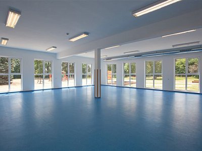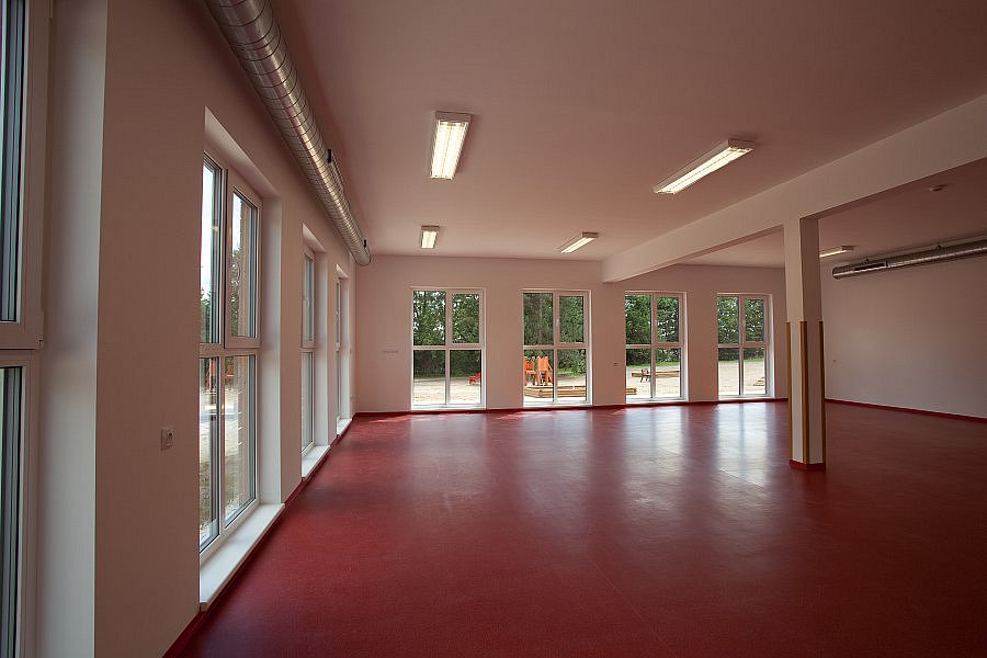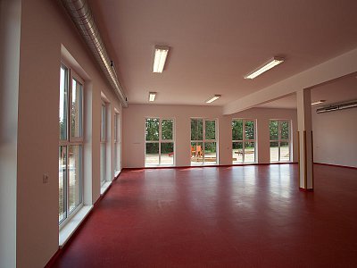 Dosluhující a nevyhovující objekty mateřské školky byly odstraněny a na jejich místě vyrostla nová, jednopodlažní budova. Návrh nové stavby pochází z architektonického ateliéru Masák & Partner a vycházel ze dvou nutných principů. Prvním principem byl požadavek na energeticky úsporné pojetí, který také souvisí s neobvykle vybraným konstrukčním systémem dřevostavby. Druhým, stejně důležitým principem, byl požadavek na jednoduché a funkční provozní uspořádání objektu. Propojením zmíněných požadavků vznikla velmi kompaktní a zároveň čitelně strukturovaná stavba. Z hlediska dispozice a organizace vnitřního provozu je objekt tvořen sestavou dvanácti prostorových modulů, kde každému z nich je přiřazena jasná funkce. Tyto jsou vzájemně propojeny sítí prostorů, jimž je kromě funkce komunikační přiřazena ještě funkce doplňková (např. úložné prostory hraček, hygienická zázemí apod.). Moduly po obvodě stavby jsou věnovány zejména pro pobytové místnosti dětí (např. herny, lehátkové části) a jeden severní modul je navržen jako kuchyně se zázemím. Pro zajištění snadné orientace dětí jsou jednotlivé pavilony pojednány barevně (každá herna má vlastní barvu). Jádro stavby vyplňuje zázemí zaměstnanců, technické zázemí budovy a jeden otevřený prostor určený jako jídelna a společenský prostor. Dominantním prvkem fasády je obložení z modřínu bez povrchové úpravy a taky screenové rolety, které nejsou jen ozdobným doplňkem, ale v souladu s energetickou úsporností budovy zajišťují odclonění nadměrných tepelných zisků v letním období. Jídelna rovněž doznala podstatných změn. Součástí komplexní dodávky bylo také stolové vybavení varny, vše samozřejmě v nerezové oceli podle norem gastro-provozů. Nová varna disponuje také chladícími a mrazícími stroji pro správné uchovávání potravin a strojem na škrábání brambor a kořenové zeleniny, aby předškoláci měli vždy čerstvou a chutnou stravu. |