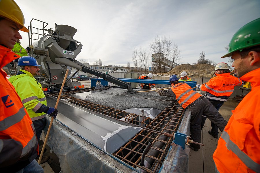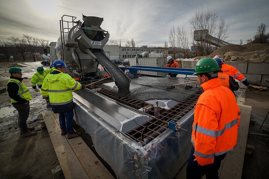 Betonáže probíhají do ocelové formy vyrobené speciálně pro tento účel. Přípravě směsi se věnovala mimořádná pozornost, kdy se nejprve vyrobily zkušební prvky, na kterých se odladil proces betonáže. Před každou betonáží se zkouší konzistence směsi odebrané přímo z mixu bezprostředně před betonáží, čímž se předchází riziku kontaminace směsi vodou nebo chemickými příměsemi zbylými v bubnu mixu.