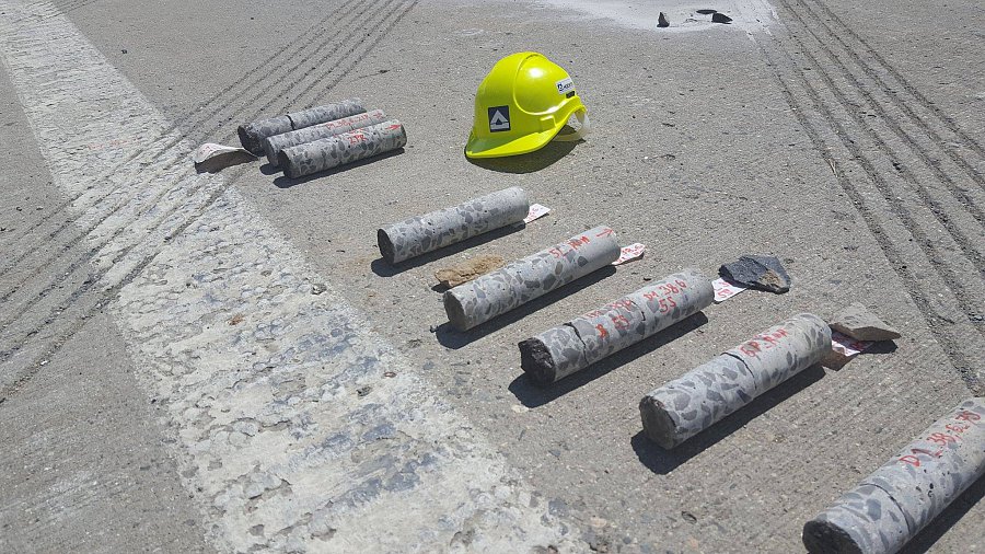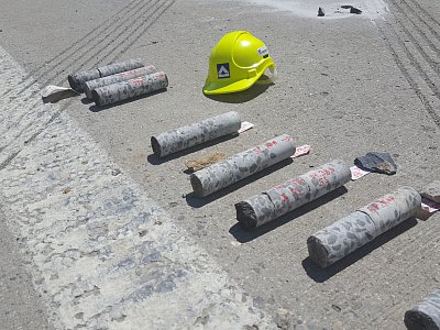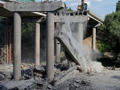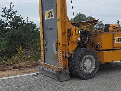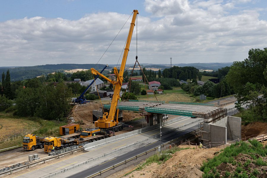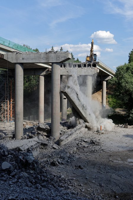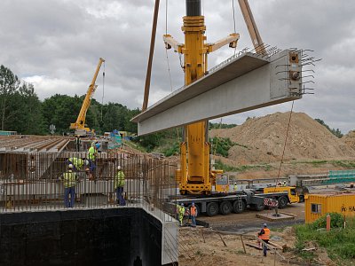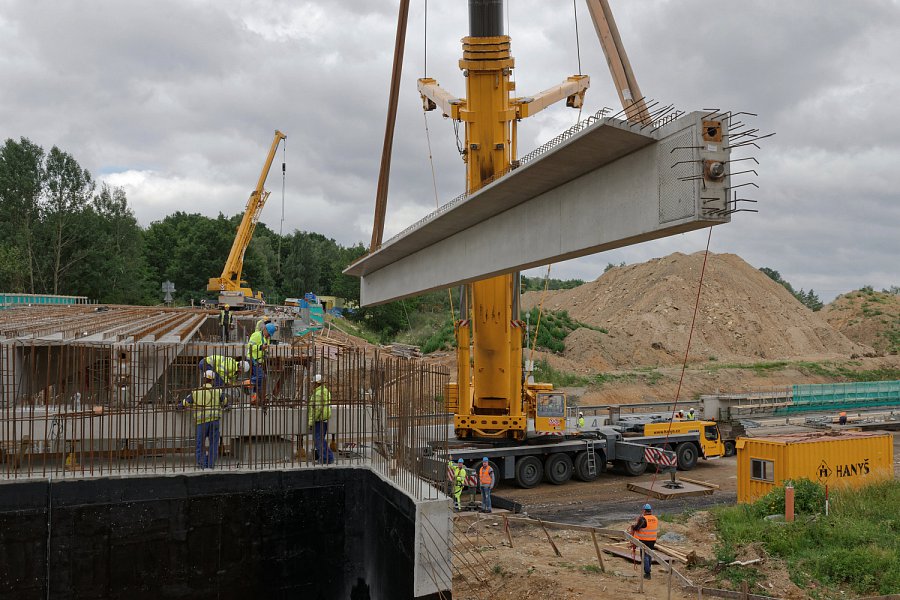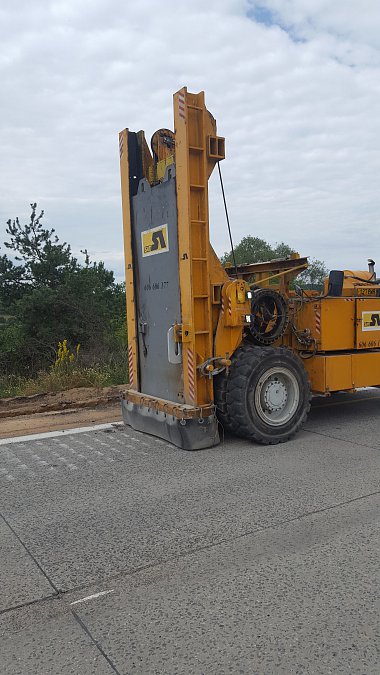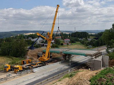 Na začátku července byla doprava na dálnici převedena do nového uspořádání tak, aby mohla být zahájena nejdůležitější etapa výstavby letošní stavební sezóny, která bude trvat 16 týdnů. Během této etapy musí být zmodernizován cementobetonový kryt s podkladními vrstvami v délce téměř sedmi kilometrů, dále musí být dokončena nosná konstrukce nadjezdů a všech dálničních mostů. Času není mnoho, proto ihned po převedení dopravy začaly intenzivní práce na demolici stávajícího cementobetonového krytu pomocí čtyř jednolamelových gilotin (foto gilotiny). Rozlámaný kryt je odvážen na mezideponii, kde probíhá jeho drcení na menší frakce a je připraven k opětovnému použití do stmelených podkladních vrstev nové vozovky (foto drtičky). V krátkých nočních uzavírkách proběhlo usazování prefabrikovaných předpjatých nosníků nadjezdů nad pojížděným pásem dálnice, přes den pak nad modernizovanou částí dálnice (foto jeřáb). Kvůli značnému vyložení při ukládání nosníků musel být použit osminápravový pětisettunový jeřáb.
