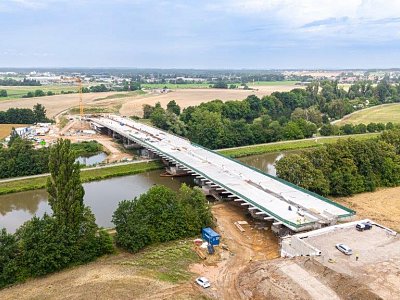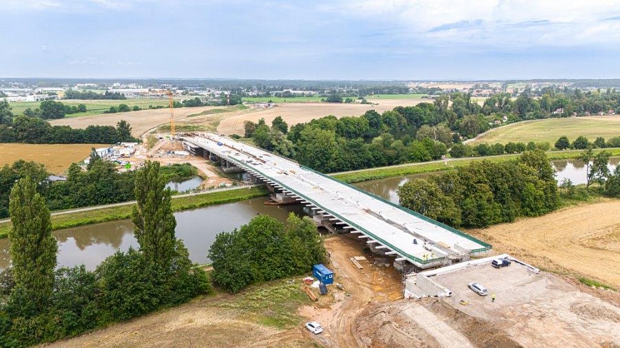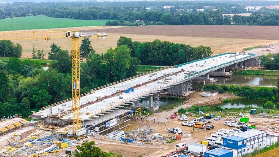 V polovině června byl za značného zájmu médií dokončen výsuv mostovky zavěšeného mostu přes Labe.