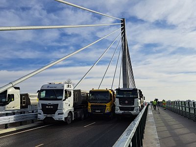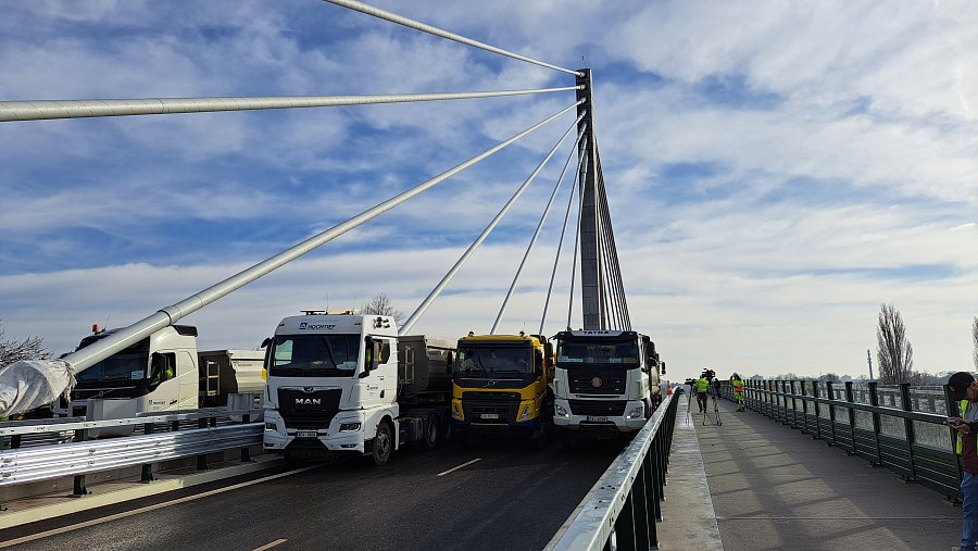Ve středu 12.11. se na zavěšeném mostě konala statická zatěžovací zkouška. Most byl zatížen vozidly ve 4 sestavách, dvě sestavy vytvářely symetrické zatížení, postupně v prvním a druhém poli. Další dvě sestavy zatěžovaly most nesymetricky kroucením. Celkem bylo k dispozici 12 zatěžovacích vozidel o celkové hmotnosti asi 400 tun. Největší zatížení při zkoušce vyvodilo asi 60% návrhového zatížení.