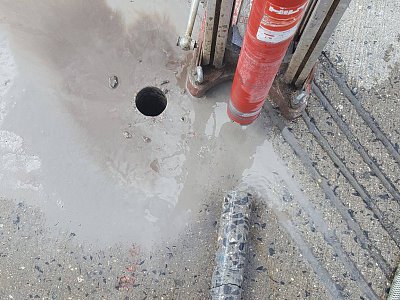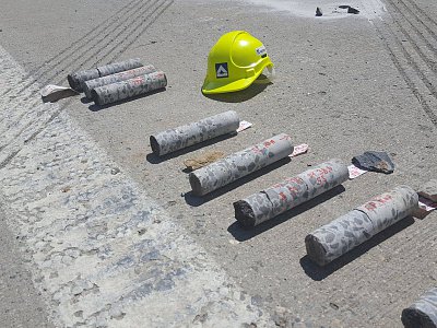 V rámci spolupráce s Fakultou stavební jsme 30. 6. 2017 zprostředkovali provedení 9 jádrových vývrtů průměru 50 mm z povrchu stávajícího cementobetonového (CB) krytu na dálnici D1 hloubky 250 mm. Tyto vzorky budou sloužit pro fluorescenční mikroskopii s cílem zjištění šířky trhlin od jednotek mikrometrů výše, rozložených po tloušťce vozovky.