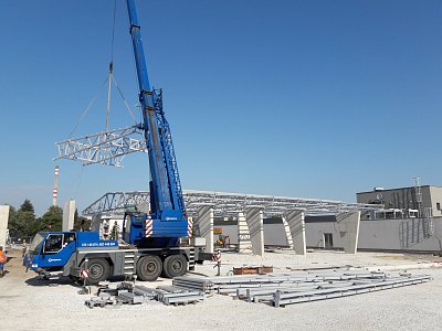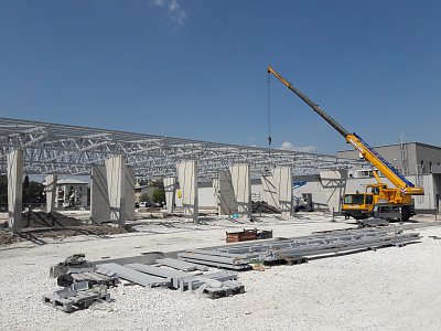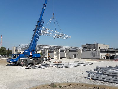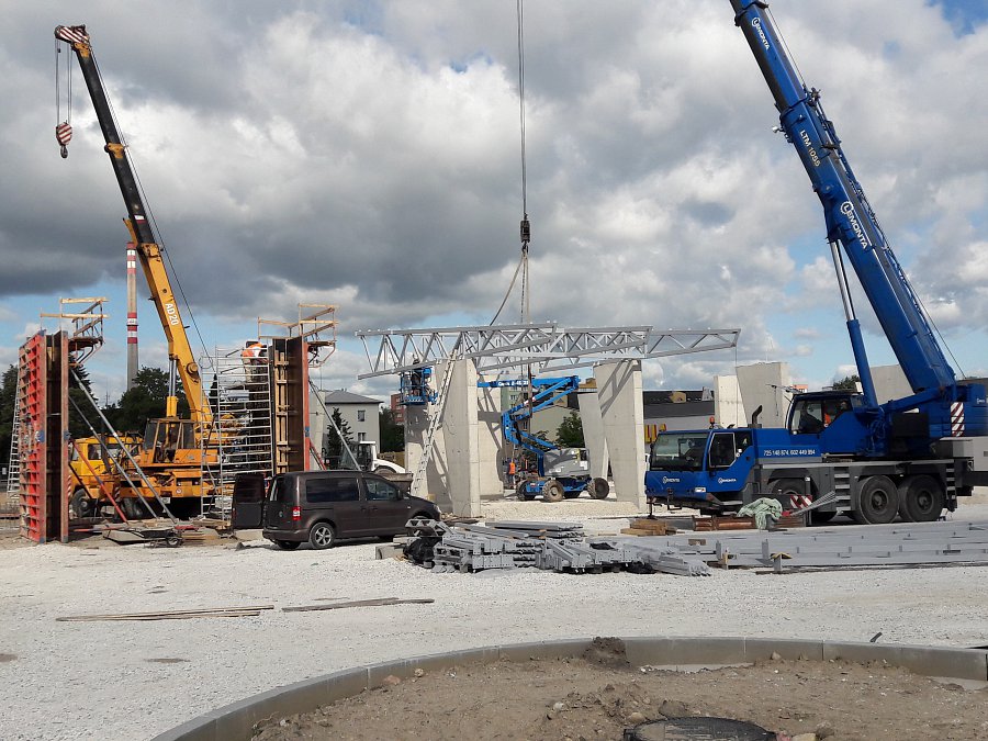 Během května a června jsme při stavbě nového dopravního terminálu ve Strakonicích vztyčili 22 převážně kónických stěnových dílců. Dnes na ně pokládáme ocelovou konstrukci zastřešení.