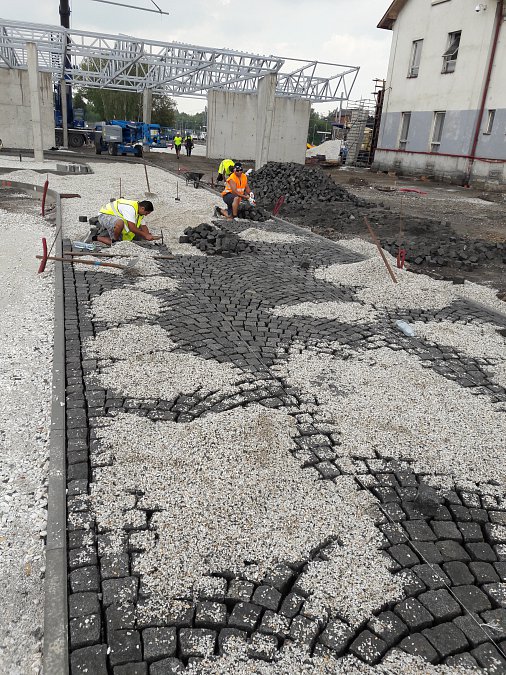 V současnosti je kompletně dokončena kanalizace a vodovod. Práce pokračují na komunikacích a parkovištích, kde se dodělávají konstrukční vrstvy a obrubníky. Na zhruba 1 700 m² parkovacích ploch budou přitom použity původní kamenné kostky. V plném proudu je už dláždění ploch pro pěší. Pokládána je velkoformátová betonová dlažba, a to až na 3 000 m².