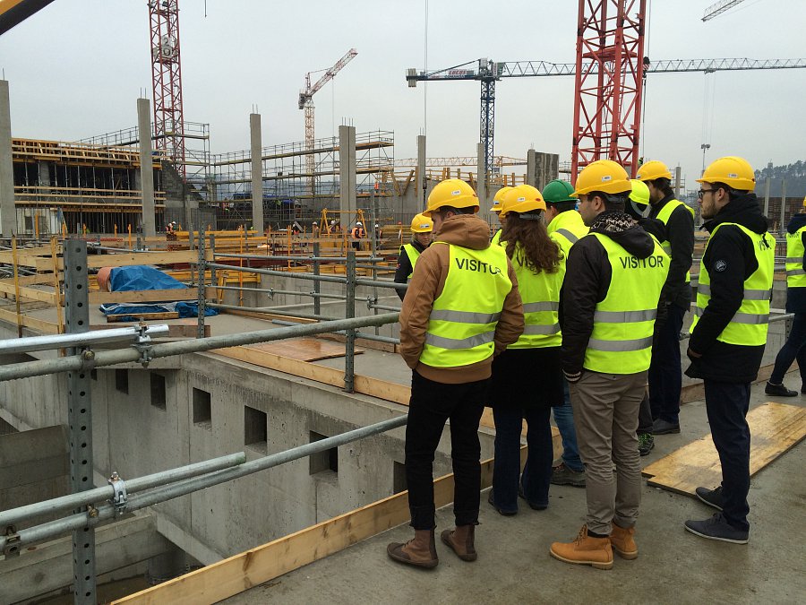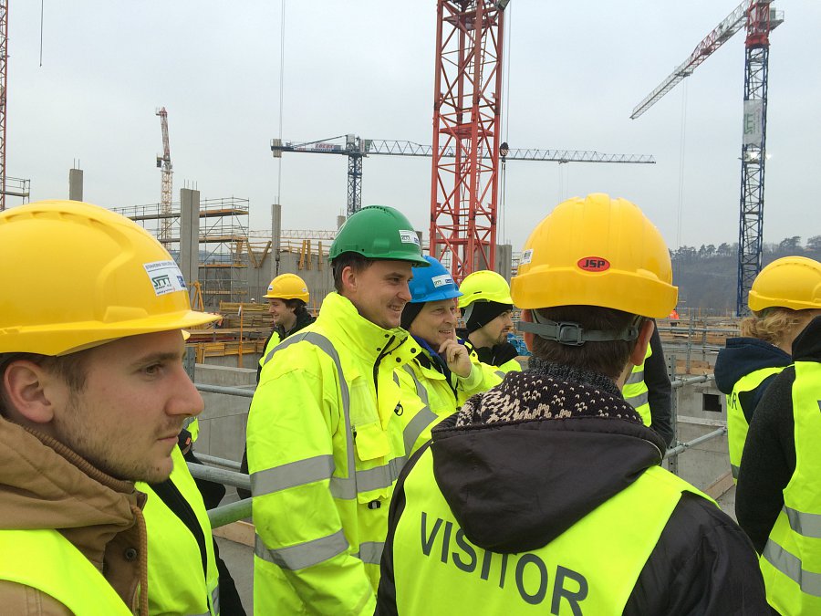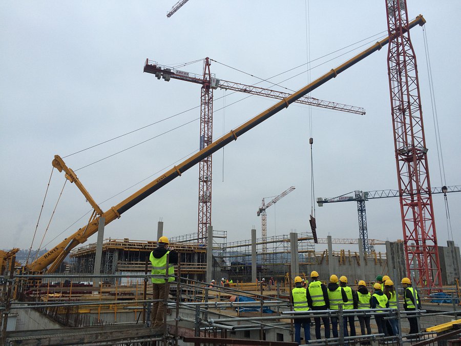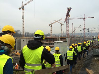 Exkurze byla rozdělena na dvě části. Samotné fyzické prohlídce této monumentální stavby předcházela úvodní prezentace na centrálním zařízení staveniště. Po seznámení se základními informacemi o projektu i s něčím navíc z každodenní reality takto velkého projektu (náročnost logistiky i komunikace při řízení stavby, úrazy, povodně, národnostní složení dělníků, apod.) a v neposlední řadě po seznámení s BOZP předpisy a „vyzbrojení“ ochrannými pomůckami, vyrazilo celkem 18 studentů přímo na stavbu. Zde si za komentáře několika našich kolegů měli možnost obejít celé 116 000 m2 velké staveniště, kterému dominuje obrovská stavební jáma o objemu cca 380 000 m3, ve které v tuto dobu probíhají práce na železobetonových konstrukcích jednotlivých nádrží, zejména pak armování a betonáže masivních základových desek a 12m vysokých stěn. V již hotových prostorech pak probíhá montáž technologických zařízení. Studenti tak měli nejen možnost v praxi vidět stavební technologie, o kterých se zatím učí jen ve škole, ale i zažít pracovní šrumec na stavbě, kde jsou v neustálém pohybu stovky lidí (někdy až 500) a stavebních strojů. Celý tento kolos ještě umocnilo 18 osazených věžových jeřábů včetně toho největšího – 52 m vysoký jeřáb s radiusem vyložení R=60m s max. zatížení na konci vyložení 4,1 tuny –, který byl na místě instalován teprve minulý týden. Věříme, že jsme studenty obohatili o zajímavý zážitek, a že pro jejich studium byla tato exkurze přínosná.