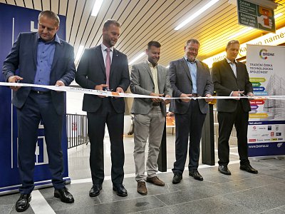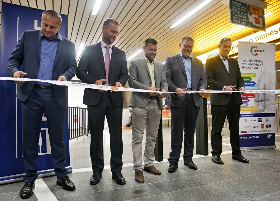Za účasti představitelů Dopravní podnik hlavního města Prahy a Praha.eu dnes přímo ve vestibulu stanice metra proběhlo slavnostní předání čerstvě dokončené stavby. Už o pár minut později se po nových eskalátorech svezli první cestující.