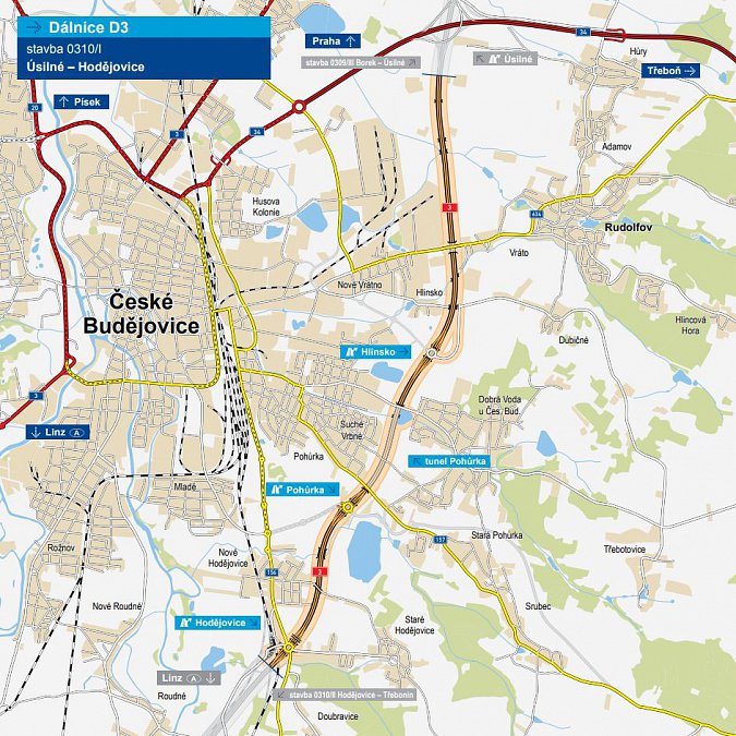 Zahájili jsme výstavbu nového úseku dálnice D3 Úsilné – Hodějovice. Projekt je součástí obchvatu kolem Českých Budějovic, měří přesně 7 197 metrů a je na něm bezmála 350 stavebních objektů, včetně tunelu Pohůrka.
