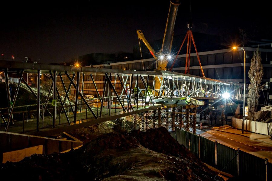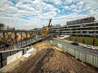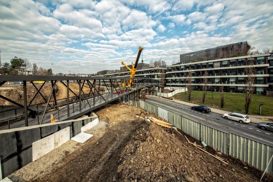 Původní a nová budova jsou propojeny lávkou, která byla nainstalována během posledního březnového víkendu. Práce si vyžádaly úplnou výluku ulice Radlická, přes kterou 163 t vážící a 90,93 m měřící ocelová konstrukce lávky vede. Na své místo ji s maximální opatrností usazoval autojeřáb s nosností 500 t.
