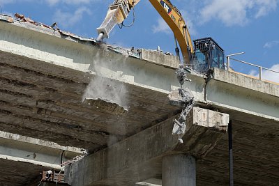 Při demolici mostů se na vozovku nejprve rozhrnul „polštář“ zeminy, který chránil stávající vozovku před padajícími úlomky sutě z nadjezdů. Tři těžké demoliční stroje se pak pustily do postupného kouskování mostů. Dva z nich hydraulickými kladivy obnažovaly předpínací výztuž a třetí ji čelistmi obrovských hydraulických nůžek stříhal. Mosty tak pomalu kousek po kousku padaly k zemi.