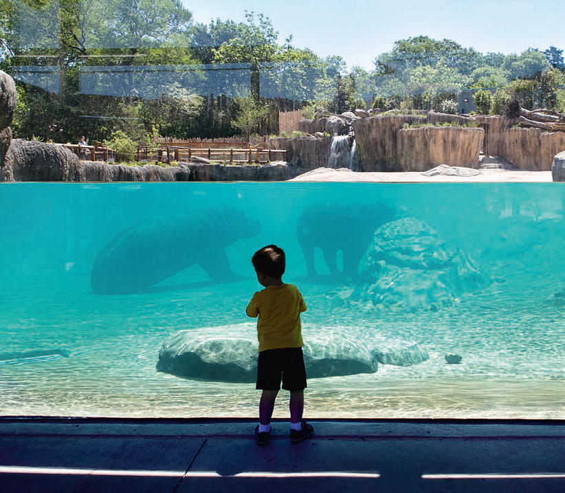 Například v ZOO v americkém Dallasu postavili naši kolegové v pavilonu hrochů prosklený výhled v nádrži, do které se vejde 455 000 litrů vody. Návštěvníci tak mohou skrze 7 x 2,5 metru velkou skleněnou tabuli sledovat tlustokožce i pod hladinou. Prostředí pro zvířata zahrnuje skály vyrobené ze stříkaného betonu i kamenný úkryt, které pro dva hrochy a jednoho štetkouna vytvářejí zázemí připomínající savanu.